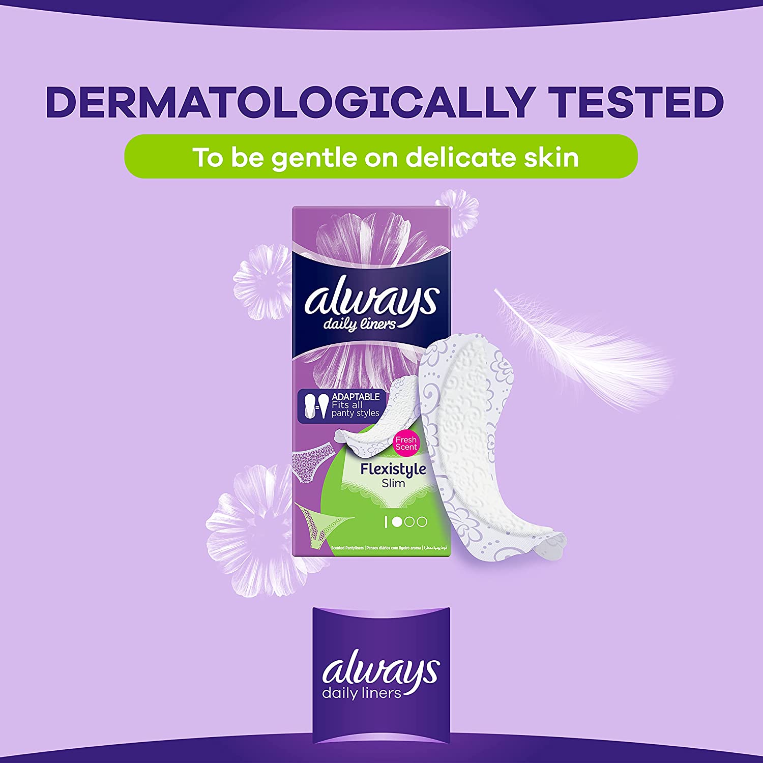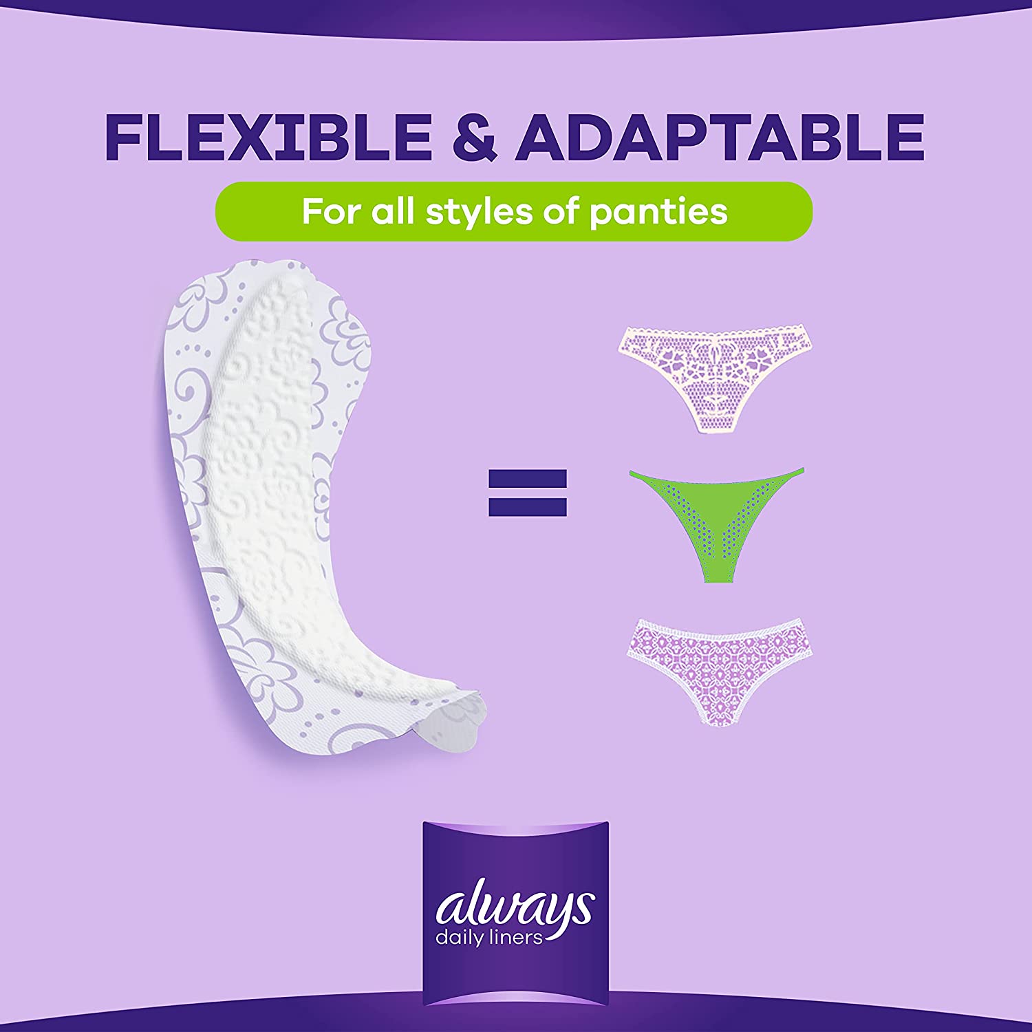 Stay fresh no matter your style. Always Daily Liners Slim Multiform Panty liners give you everyday freshness you can rely on, flexible enough to fit all styles of underwear, yet thinner than 1mm for added comfort and flexibility. With a breathable design that provides trusted dryness these Panty liners are suited for your everyday life. Lightly scented. Ideal for vaginal discharge or as added protection for irregular periods.