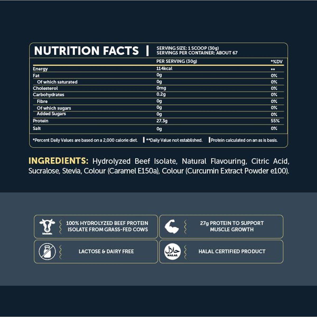Hydrolyzed Beef Isolate, Natural Flavouring, Citric Acid, Sucralose, Stevia, Colour (Caramel E150a), Colour (Curcumin Extract Powder e100).