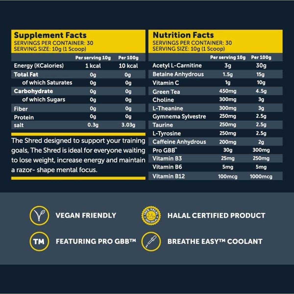 Acetyl L-Carnitine, Betaine Anhydrous, Citric Acid, Vitamin C, Green Tea, Caffeine Anhydrous, Choline Bitartrate, L-Theanine, R-Alpha Lipoic Acid, Taurine, L-Tyrosine, Sodium Bicarbonate, Natural Flavour, Natural Colour, Anti-clumping agents, Breathe Easy Flavour, Pro GBB, Sucralose, Chromium Picolinate, Vitamins B3, B6, B12.
