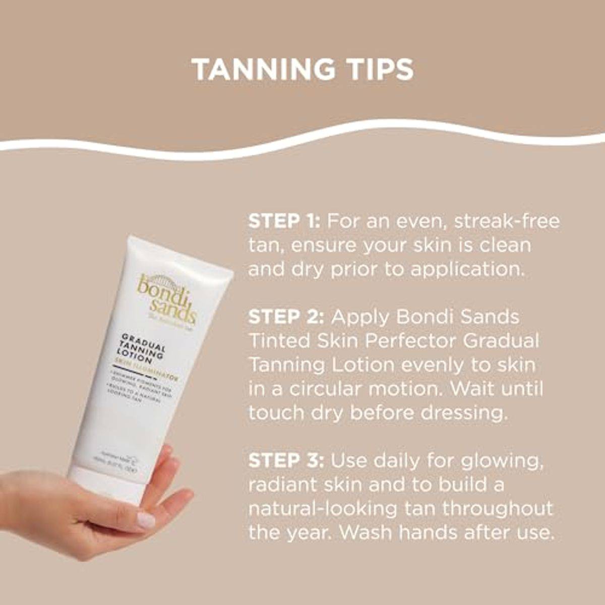 Apply evenly to skin in a circular motion. Wait until touch dry before dressing. Use daily to build tan. Wash hands after use.