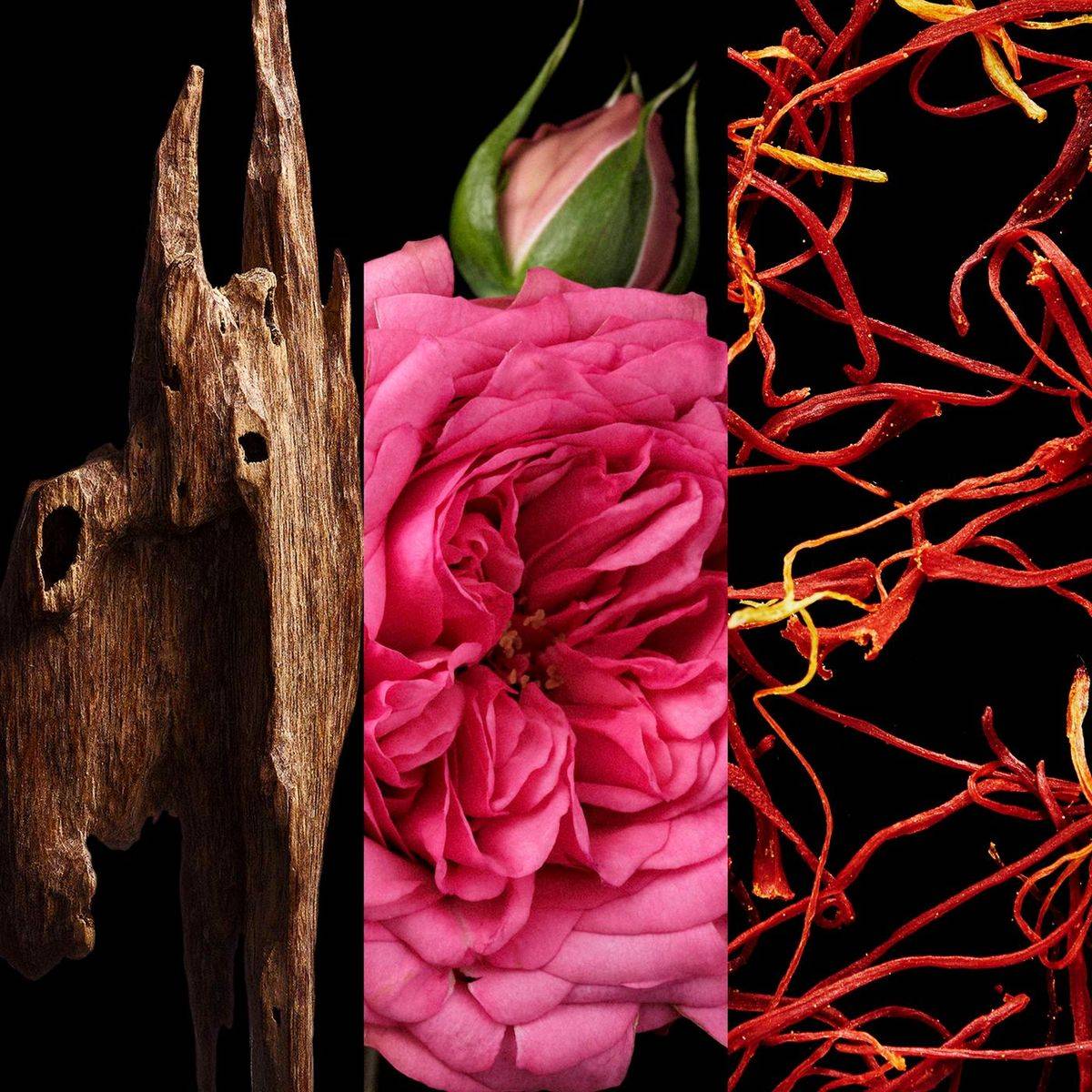 Oud, Rose, Saffron, Benzoin, Olibanum, Black Pepper, Damask Rose, Rose Taif.