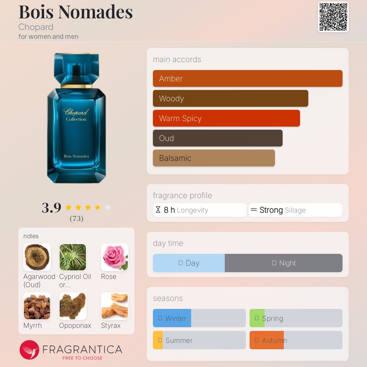 Chopard Collection Bois Nomades is a luxurious unisex Eau de Parfum. It features a captivating blend of amber, woody, and spicy notes, with top notes of tobacco, black pepper, cinnamon, and clove. The heart reveals Damask Rose, while the base is enriched with agarwood, cypriol oil, and myrrh. Perfect for those seeking a unique and memorable scent.
