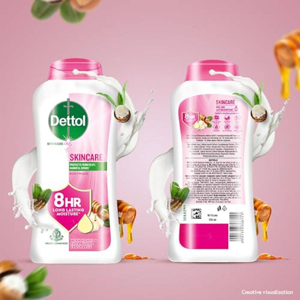 Dettol Antibacterial Shower Gel Skincare 250ml provides 8 hours of long-lasting moisture with honey and shea butter. Ideal for both men and women, it ensures soft, nourished skin.