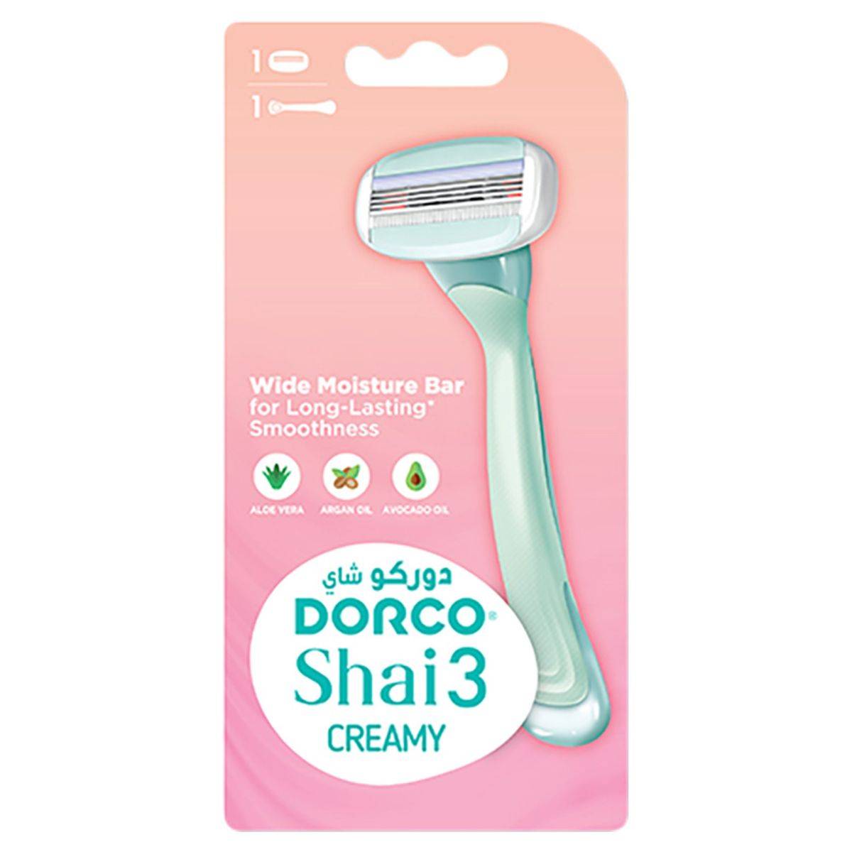 The Dorco Razor Shai 3 Creamy Women features 3 blades and dual wide moisture bars with Aloe Vera, Argan, and Avocado Oil for a nourishing shave. Ergonomically designed for comfort.
