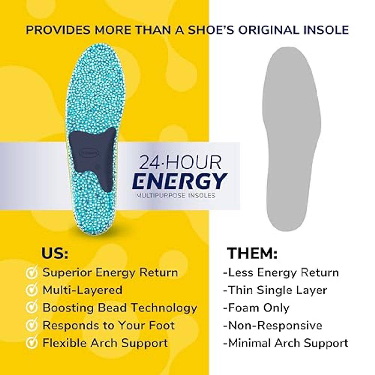Dr. Scholl's 24-Hour Energy Multipurpose Insoles are designed for those who want to move more. They relieve tired, achy feet and muscle soreness by distributing pressure and returning energy with every step. Featuring Boosting Beads technology, memory foam, and flexible gel, they provide comfort and support for walking, running, and daily activities. Clinically proven to reduce fatigue and provide long-lasting comfort.