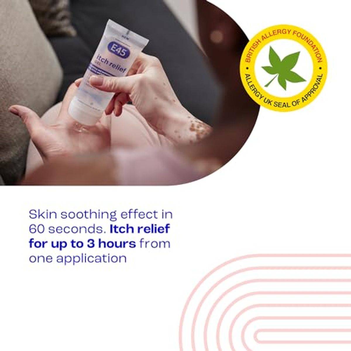 E45 Itch Relief Gel is a fast-absorbing, non-greasy formula designed to soothe dry, itchy skin. Infused with glycerin and Vitamin B5, it provides immediate relief and hydration, suitable for the whole family.