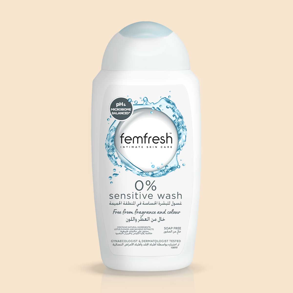 Femfresh Intimate Wash Sensitive 0% is a gentle, plant-based wash designed for sensitive skin. It contains Lotus Flower and Bamboo extracts to hydrate and soothe, maintaining the skin's natural pH balance. Free from soap, fragrance, and color, it is suitable for daily use to keep intimate areas clean and comfortable.
