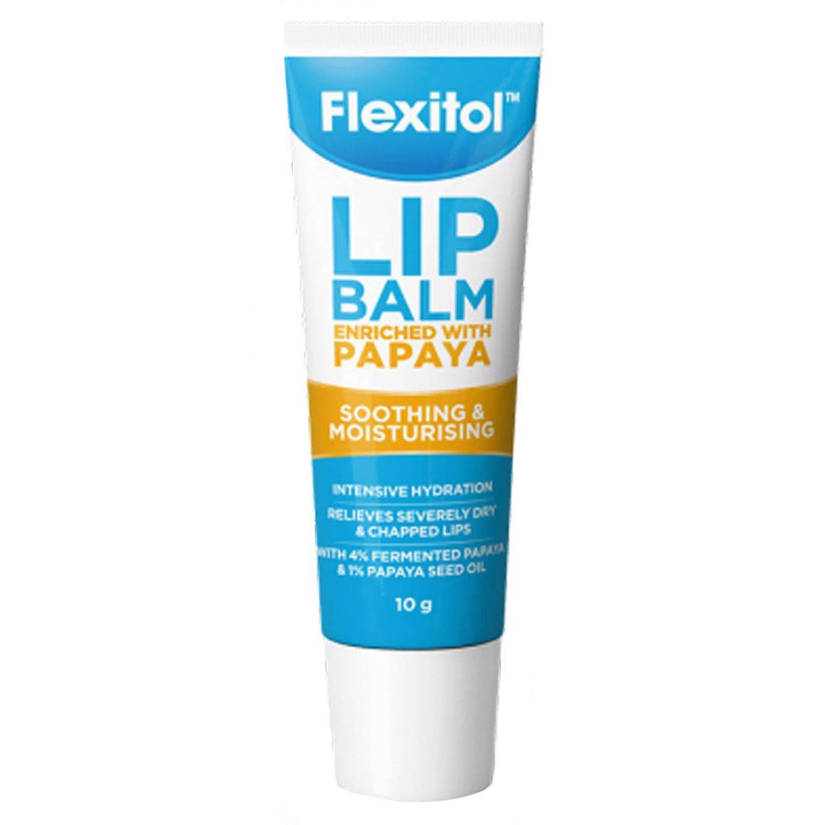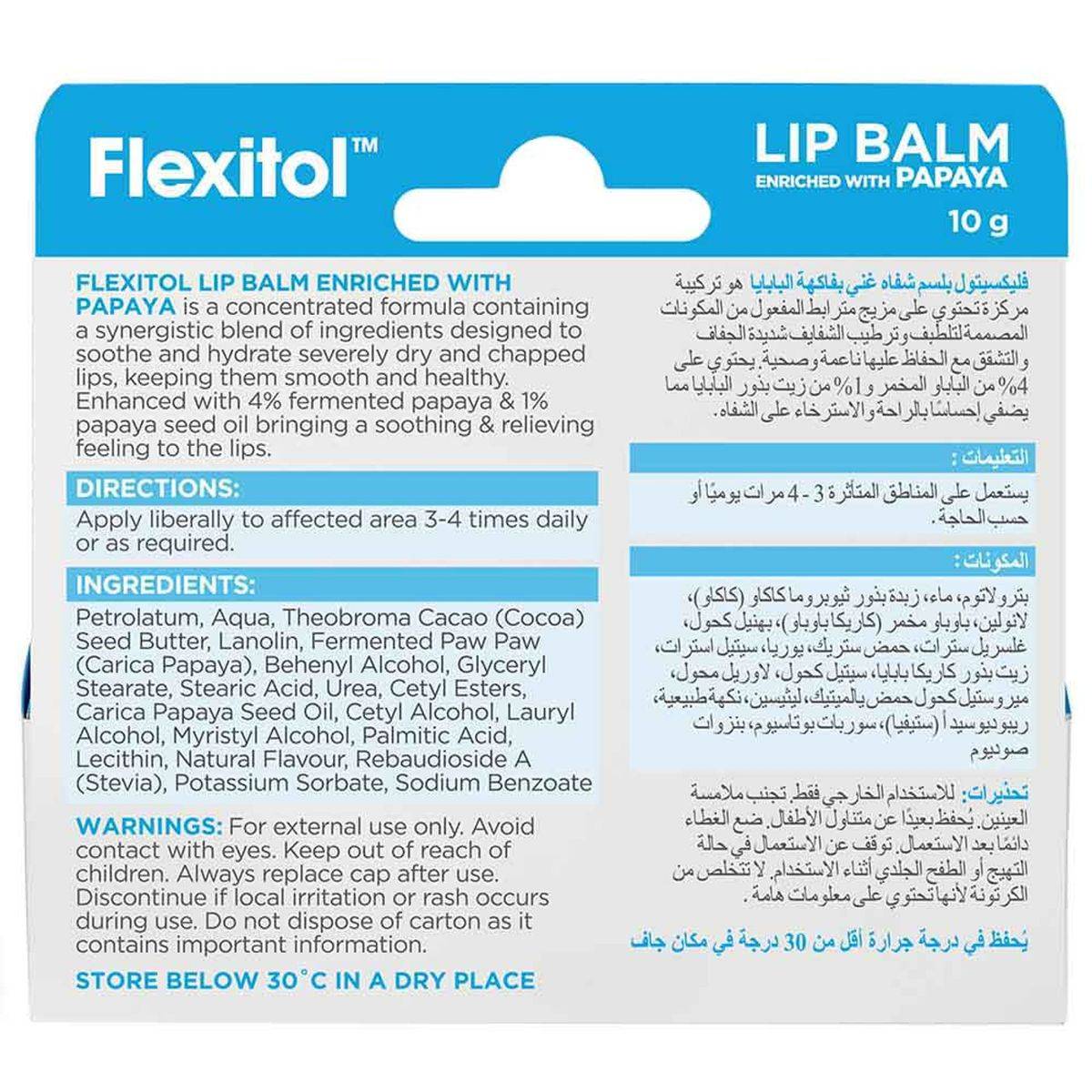 Flexitol Lip Balm Papaya 10g is a concentrated formula designed to soothe and hydrate severely dry and chapped lips. Enhanced with 4% fermented papaya and 1% papaya seed oil, it provides intensive hydration and visible results in one day.