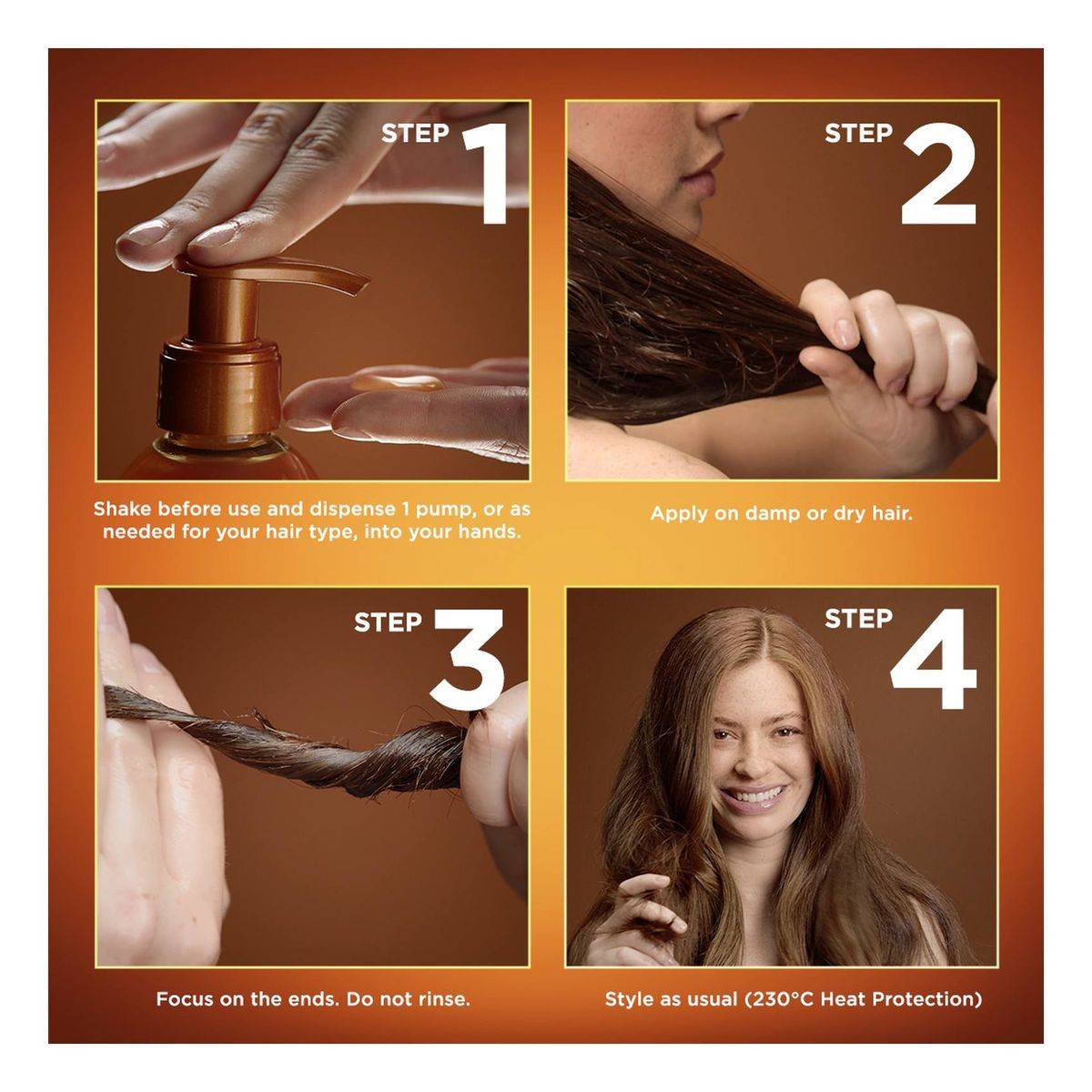 Garnier Ultra Doux Honey Treasure Serum is a repairing hair serum designed to reduce split ends by 94%. It offers 230°C heat protection, making hair 6x smoother and 2x shinier. Ideal for daily use on damp or dry hair.