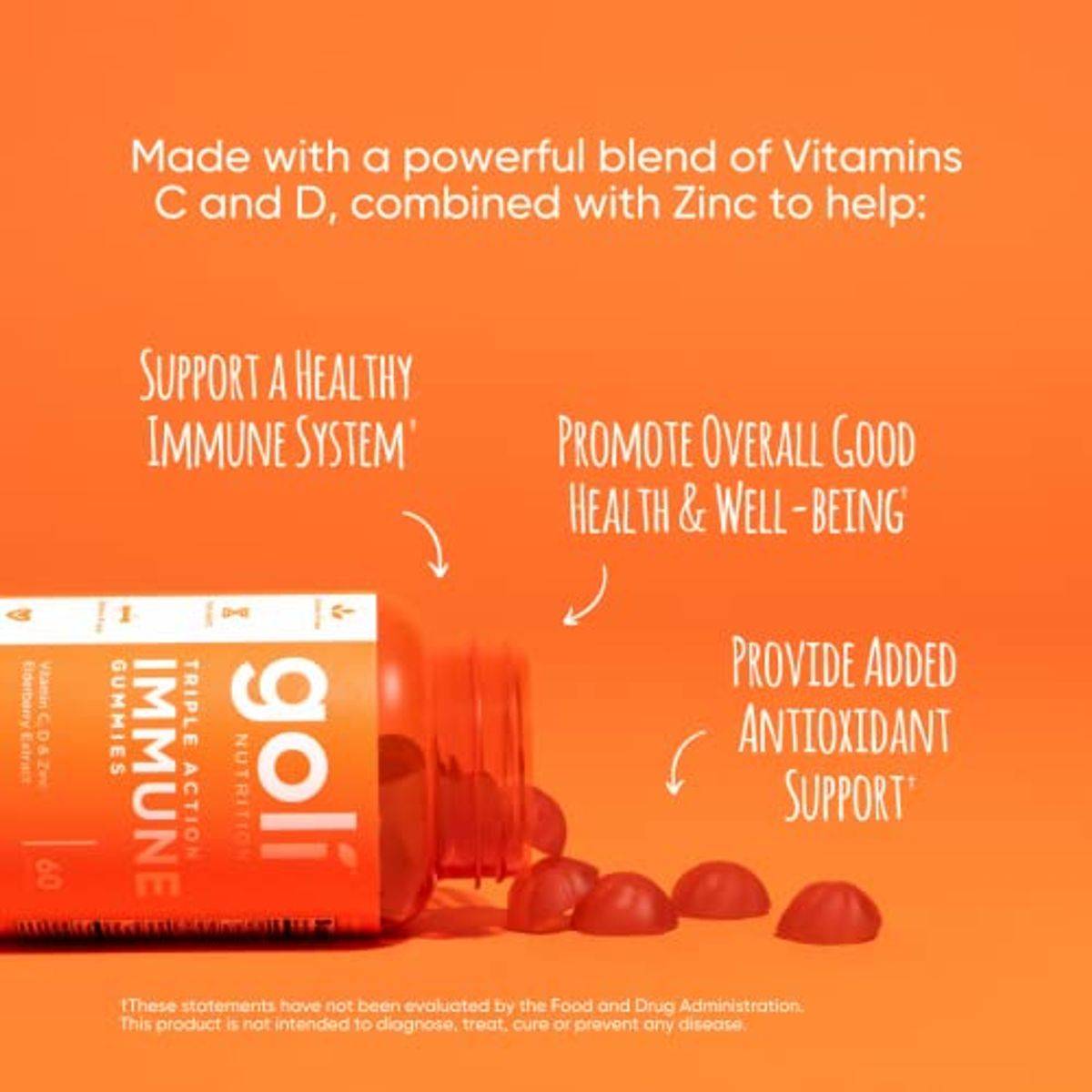 Goli Nutrition Immune Gummies are designed to support immune health with a blend of Vitamin C, D, Zinc, and Elderberry extract. Vegan, gluten-free, and gelatin-free.