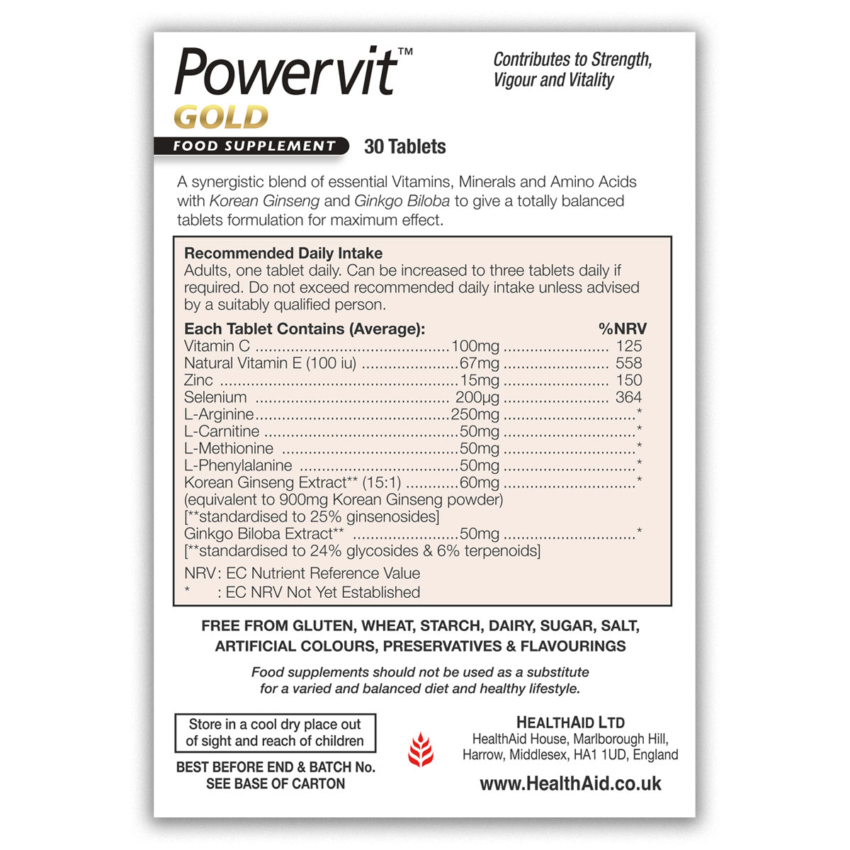 HealthAid PowerVit Gold is a synergistic blend of essential vitamins, minerals, and amino acids with Korean Ginseng and Ginkgo Biloba. It supports vitality, energy, stamina, libido, hormonal balance, and sexual health. Zinc, Selenium, Vitamin C, and E act as antioxidants, reducing oxidative damage and supporting fertility. Ideal for adults seeking to enhance their overall wellness and vitality.