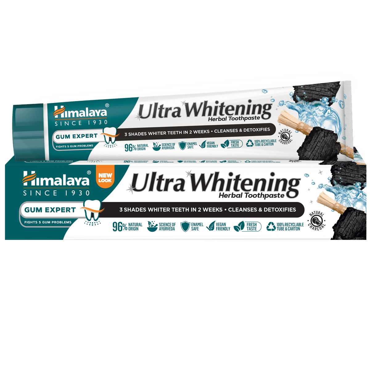 Himalaya Ultra Whitening Herbal Toothpaste is formulated with activated coconut charcoal powder for whitening. It includes herbs like Miswak, Almond Shell, and Blackseed Oil to tighten gums and remove plaque, keeping teeth strong and breath fresh for up to 12 hours.