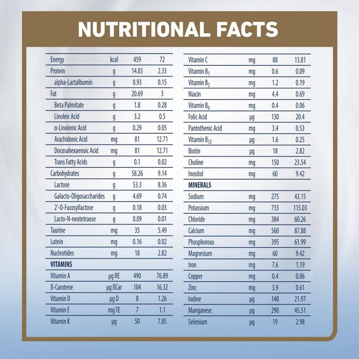 Skimmed Milk (from Cow's Milk), Lactose, Vegetable Oils [High sn-2 Palmitic Palm Oil, High Oleic Sunflower Oil, Low Erucic Rapeseed Oil, Sunflower Oil, Arachidonic Acid (from Mortierella Alpina Oil)], Whey Protein (from Cow's Milk), Galacto-Oligosaccharides, Emulsifier (Soy Lecithin), Docosahexaenoic Acid (from Tuna Fish), 2'-Fucosyllactose, Lacto-N-Neotetraose, Taurine, Nucleotides (Cytidine-5'-Monophosphate, Disodium Uridine-5'-Monophosphate, Adenosine-5'-Monophosphate, Disodium Guanosine-5'-Monophosphate, Disodium Inosine 5'-Monophosphate), Antioxidants (Mixed Tocopherol Concentrate, L-Ascorbyl Palmitate), Acidity Regulators (Citric Acid, Potassium Hydroxide), Lutein, Vitamins: Choline, Vitamin C, Inositol, Vitamin E, Niacin, Pantothenic Acid, Vitamin A, Vitamin B1, Vitamin B6, Vitamin B2, Beta-Carotene, Folic Acid, Vitamin K, Biotin, Vitamin D, Vitamin B12. Minerals: Calcium Citrate, Sodium Citrate, Sodium Phosphate, Magnesium Citrate, Potassium Citrate, Potassium Chloride, Ferrous Sulfate, Zinc Sulfate, Copper Sulfate, Manganese Sulfate, Potassium Iodide, Sodium Selenate. Contains Milk, Soy & Fish.