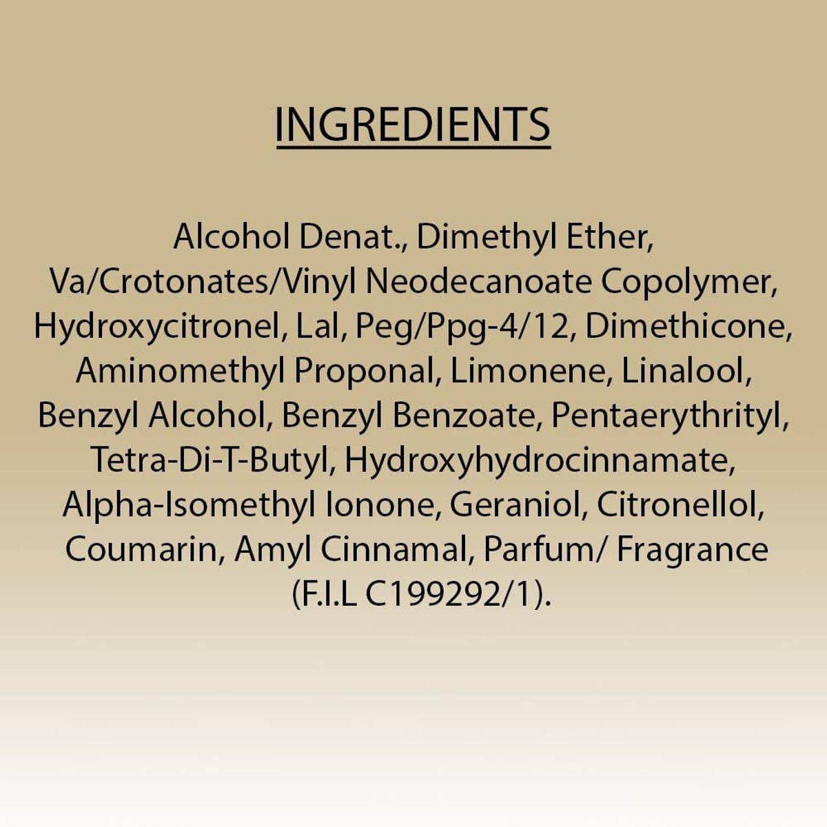 Alcohol Denat., Dimethyl Ether, Va/Crotonates/Vinyl Neodecanoate Copolymer, Hydroxycitronellal, Peg/Ppg-4/12 Dimethicone, Aminomethyl Propanol, Limonene, Linalool, Benzyl Alcohol, Benzyl Benzoate, Pentaerythrityl Tetra-Di-T-Butyl Hydroxyhydrocinnamate, Alpha-Isomethyl Ionone, Geraniol, Citronellol, Coumarin, Amyl Cinnamal, Parfum/Fragrance.