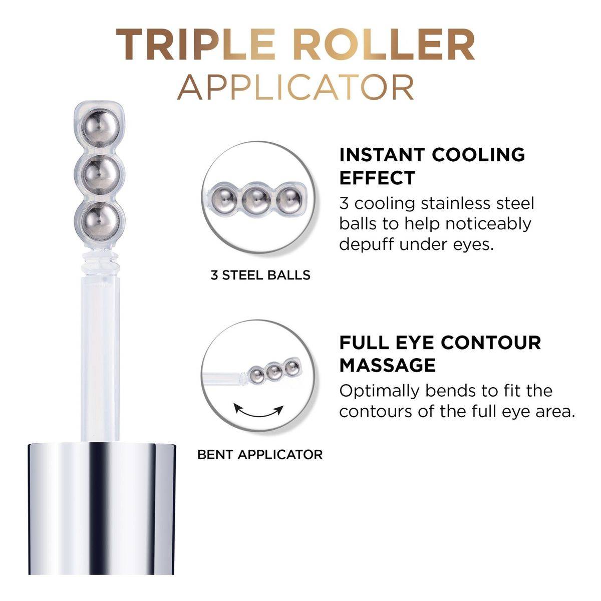 This eye serum is formulated with 3% Glycolic Acid, Vitamin CG, and Niacinamide to visibly reduce dark circles and brighten the eye area. It features a triple roller applicator for precise application and an instant cooling effect, suitable for all skin types.