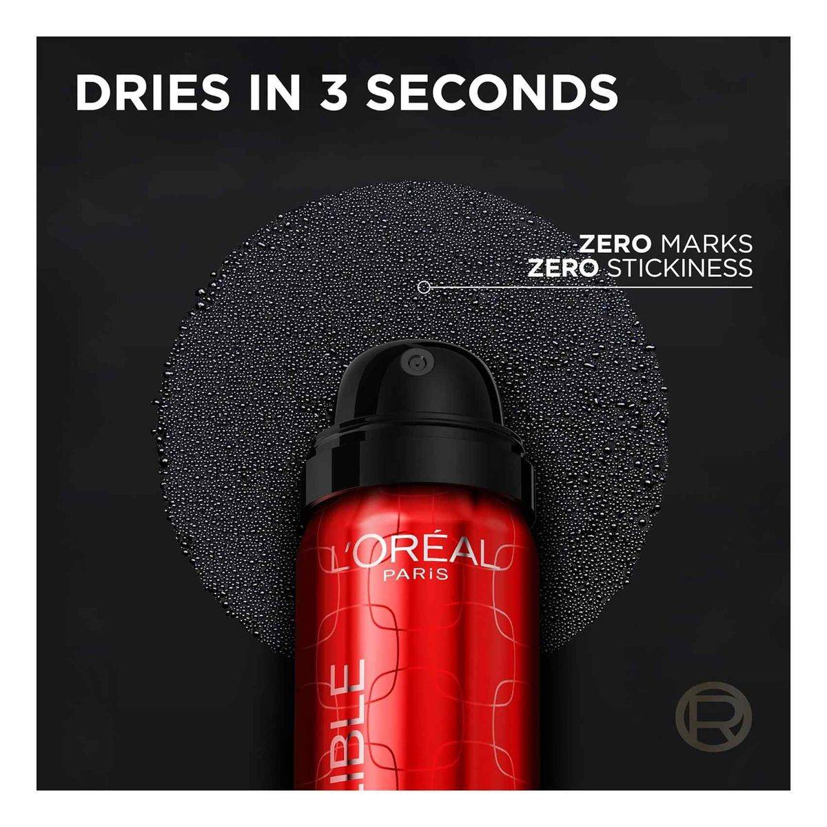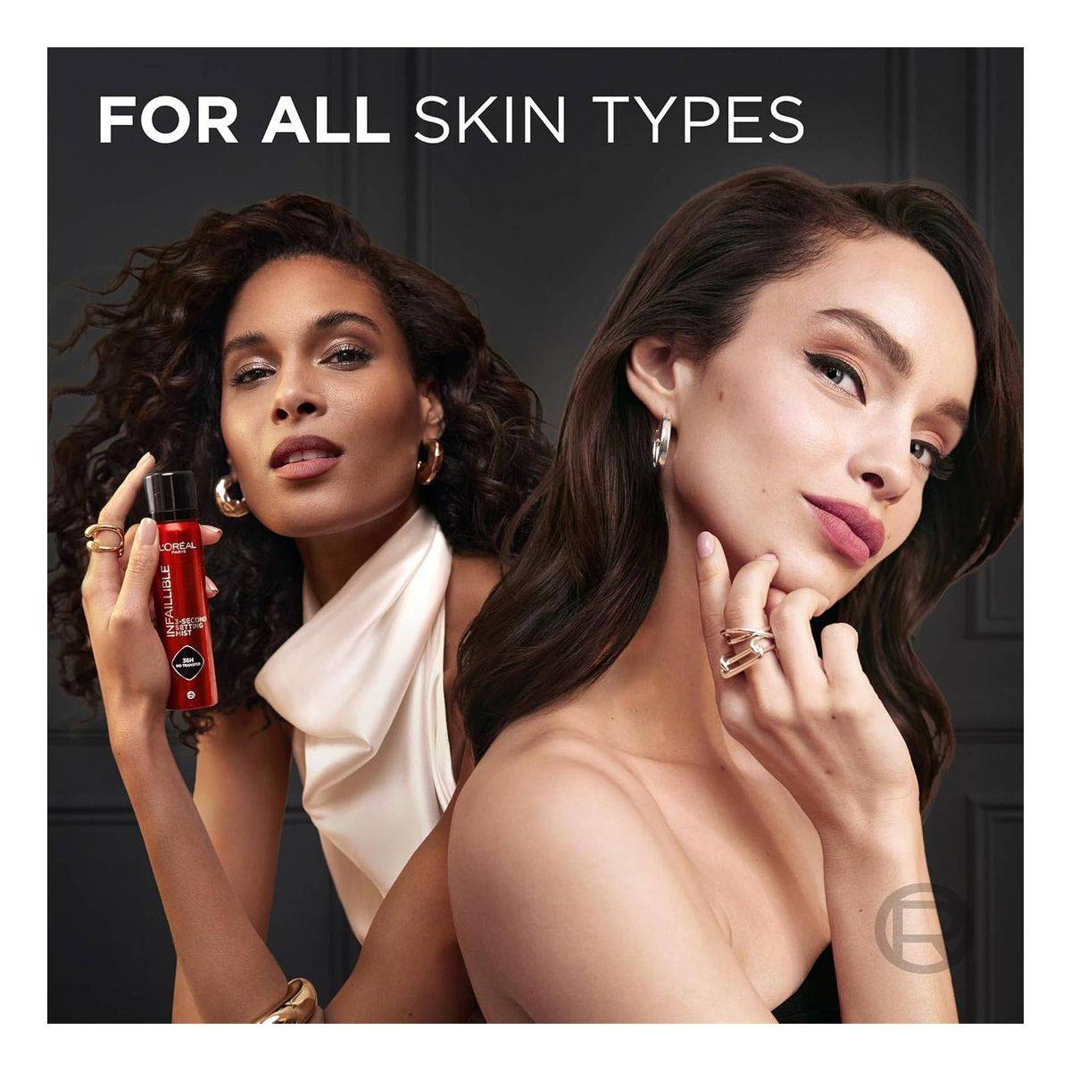 L'Oréal Paris Infallible 3 Seconds Setting Mist offers a quick-drying, transfer-proof formula for up to 36-hour wear. Ideal for all skin types, it ensures a flawless finish without stickiness.