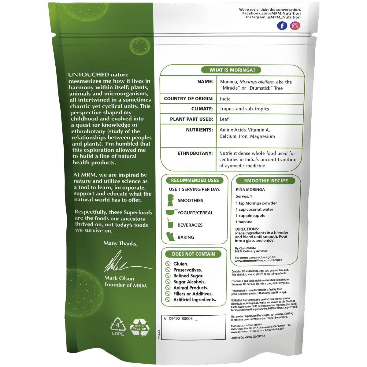 MRM Nutrition Moringa Powder is a nutrient-dense, high-protein, and high-fiber whole leaf powder. It contains essential amino acids, calcium, and potassium, supporting bone density and electrolyte balance. USDA Organic, Non-GMO, and Vegan certified, it is ideal for smoothies, yogurts, and cereals.
