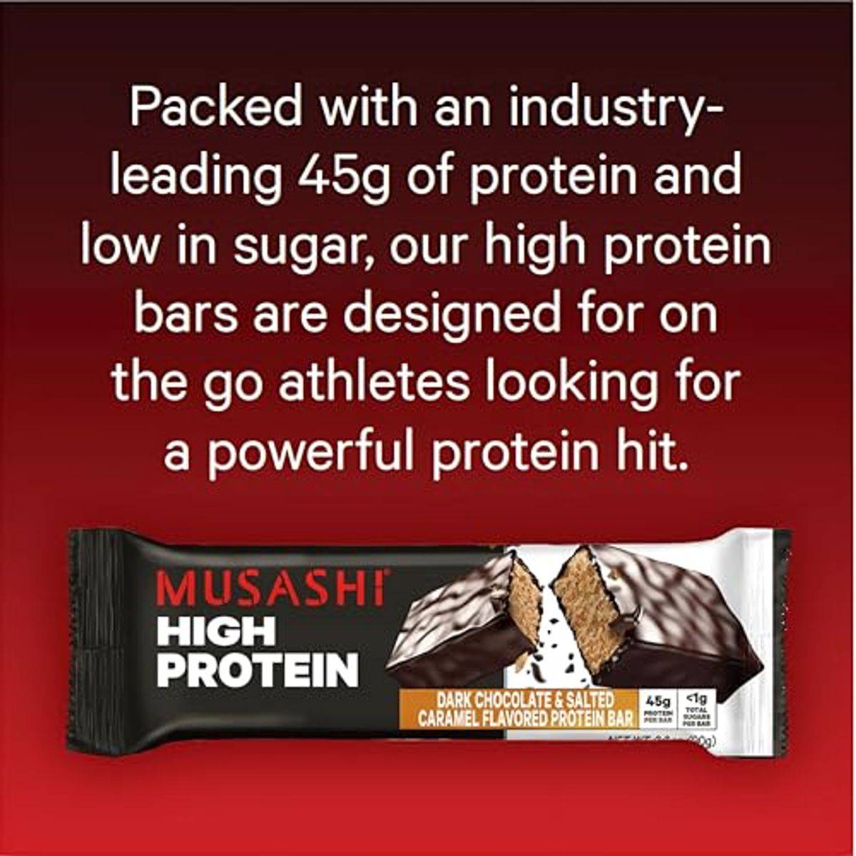 Musashi High Protein Bar Dark Salted Caramel is a delicious chocolate-coated bar with 45g of protein. Ideal for athletes seeking a powerful protein hit post-workout or as a nutritious snack.