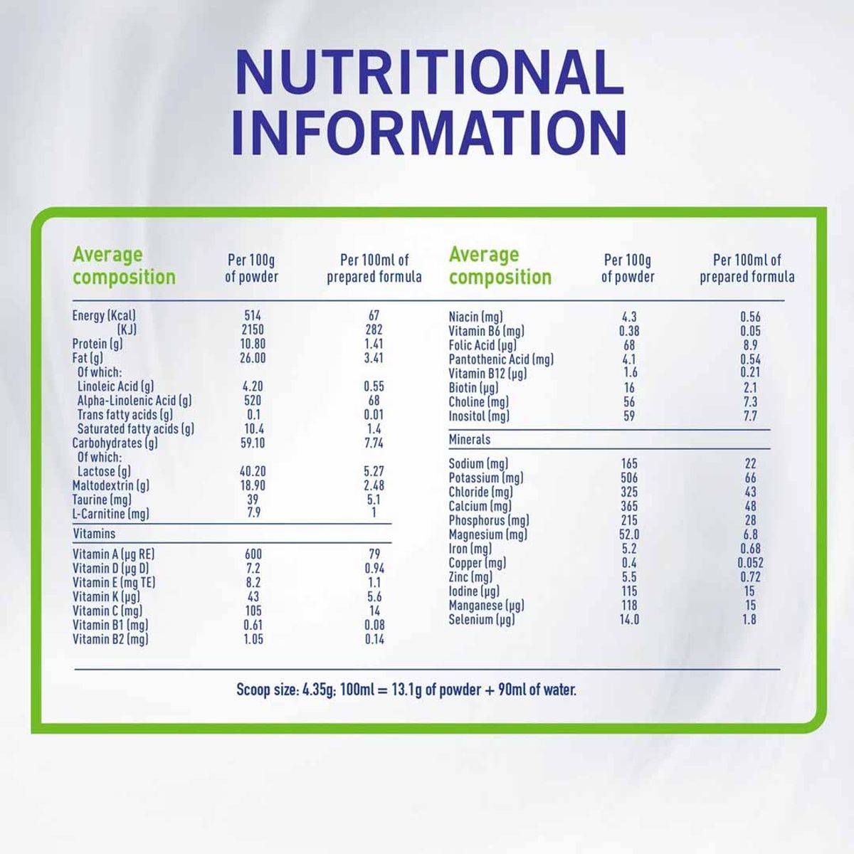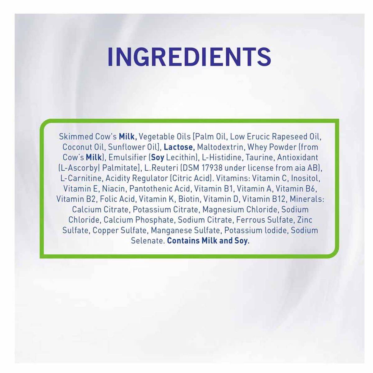 Skimmed Cow's Milk, Vegetable Oils (Palm Oil, Low Erucic Rapeseed Oil, Coconut Oil, Sunflower Oil), Lactose, Maltodextrin, Whey Powder (from Cow's Milk), Emulsifier (Soy Lecithin), L-Histidine, Taurine, Antioxidant (L-Ascorbyl Palmitate), L. Reuteri (DSM 17938 under license from BioGaia AB), L-Carnitine, Acidity Regulator (Citric Acid), Vitamins: Vitamin C, Inositol, Vitamin E, Niacin, Pantothenic Acid, Vitamin B1, Vitamin A, Vitamin B6, Vitamin B2, Folic Acid, Vitamin K, Biotin, Vitamin D, Vitamin B12, Minerals: Calcium Citrate, Potassium Citrate, Magnesium Chloride, Sodium Chloride, Calcium Phosphate, Sodium Citrate, Ferrous Sulfate, Zinc Sulfate, Copper Sulfate, Manganese Sulfate, Potassium Iodide, Sodium Selenate. Contains Milk and Soy.