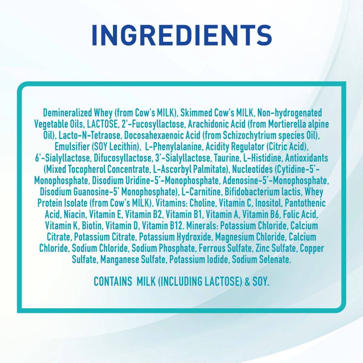 Demineralized Whey (from Cow's MILK), Skimmed Cow's MILK, Non-hydrogenated Vegetable Oils, LACTOSE, 2'-Fucosyllactose, Arachidonic Acid (from Mortierella alpine Oil), Lacto-N-Tetraose, Docosahexaenoic Acid (from Schizochytrium species Oil), Emulsifier (SOY Lecithin), L-Phenylalanine, Acidity Regulator (Citric Acid), 6'-Sialyllactose, Difucosyllactose, 3'-Sialyllactose, Taurine, L-Histidine, Antioxidants (Mixed Tocopherol Concentrate, L-Ascorbyl Palmitate), Nucleotides (Cytidine-5'-Monophosphate, Disodium Uridine-5'-Monophosphate, Adenosine-5'-Monophosphate, Disodium Guanosine-5' Monophosphate), L-Carnitine, Bifidobacterium lactis, Whey Protein Isolate (from Cow's MILK). Vitamins: Choline, Vitamin C, Inositol, Pantothenic Acid, Niacin, Vitamin E, Vitamin B2, Vitamin B1, Vitamin A, Vitamin B6, Folic Acid, Vitamin K, Biotin, Vitamin D, Vitamin B12. Minerals: Potassium Chloride, Calcium Citrate, Potassium Citrate, Potassium Hydroxide, Magnesium Chloride, Calcium Chloride, Sodium Chloride, Sodium Phosphate, Ferrous Sulfate, Zinc Sulfate, Copper Sulfate, Manganese Sulfate, Potassium Iodide, Sodium Selenate.