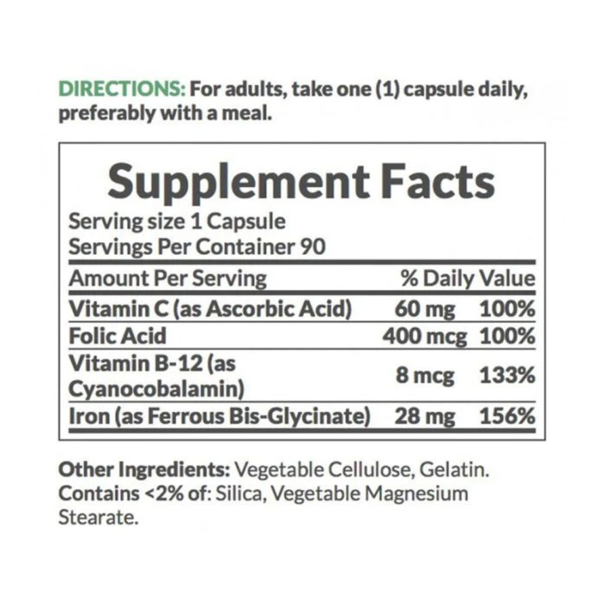 Each capsule contains 28?mg of iron (as Ferrous Bis?Glycinate), along with Vitamin C Folic Acid (400?µg), and Vitamin B??