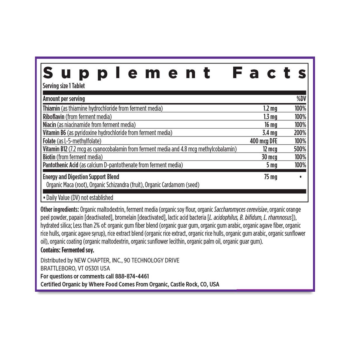 Thiamin, Riboflavin, Niacin, Vitamin B6, Folate (as methylfolate), Vitamin B12 (as cyanocobalamin and methylcobalamin), Biotin, Pantothenic Acid, Organic Maca Root, Organic Schizandra (fruit), Organic Cardamom (fruit), Organic gum acacia, organic brown rice, ferment media (organic soy flour, organic Saccharomyces cerevisiae, organic orange peel powder, papain [deactivated], bromelain [deactivated], and lactic acid bacteria [Lactobacillus acidophilus, Bifidobacterium bifidum, Lactobacillus rhamnosus]), silica and organic coating (organic tapioca maltodextrin, organic sunflower lecithin, organic palm oil and organic guar gum).