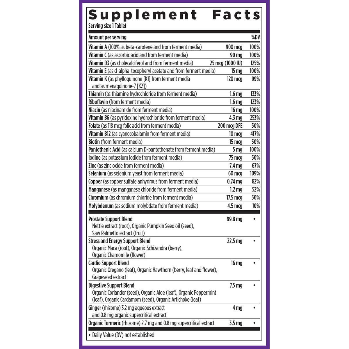 Vitamin A (100% as beta-carotene and from ferment media), Vitamin C (as ascorbic acid and from ferment media), Vitamin D3 (as cholecalciferol and from ferment media), Vitamin E (as d-alpha-tocopheryl acetate and from ferment media), Vitamin K (as phylloquinone [K1] from ferment media and as menaquinone-7 [K2]), Thiamin (as thiamine hydrochloride from ferment media), Riboflavin (from ferment media), Niacin (as niacinamide from ferment media), Vitamin B6 (as pyridoxine hydrochloride from ferment media), Folate (as folic acid from ferment media), Vitamin B12 (as cyanocobalamin from ferment media), Biotin (from ferment media), Pantothenic Acid (as calcium D-pantothenate from ferment media), Iodine (as potassium iodide from ferment media), Zinc (as zinc oxide from ferment media), Selenium (as selenium yeast from ferment media), Copper (as copper sulfate anhydrous from ferment media), Manganese (as manganese chloride from ferment media), Chromium (as chromium chloride from ferment media), Molybdenum (as sodium molybdate from ferment media), Prostate Support Blend (Nettle extract [root], Organic Pumpkin Seed oil [seed], Saw Palmetto extract [fruit]), Stress and Energy Support Blend (Organic Maca [root], Organic Schizandra [berry], Organic Chamomile [flower]), Cardio Support Blend (Organic Oregano [leaf], Organic Hawthorn [berry, leaf and flower], Grapeseed extract), Digestive Support Blend (Organic Coriander [seed], Organic Aloe [leaf], Organic Peppermint [leaf], Organic Cardamom [seed], Organic Artichoke [leaf]), Ginger (rhizome) aqueous extract and organic supercritical extract, Organic Turmeric (rhizome) supercritical extract, Ferment media (organic soy flour, organic Saccharomyces cerevisiae, organic orange peel powder, organic alfalfa powder, bromelain [deactivated], papain [deactivated], organic carrot powder, lactic acid bacteria [Lactobacillus acidophilus, Lactobacillus rhamnosus, Bifidobacterium bifidum]), organic maltodextrin, organic gum acacia, hydrated silica, organic coating (organic maltodextrin, organic sunflower lecithin, organic palm oil, organic guar gum).