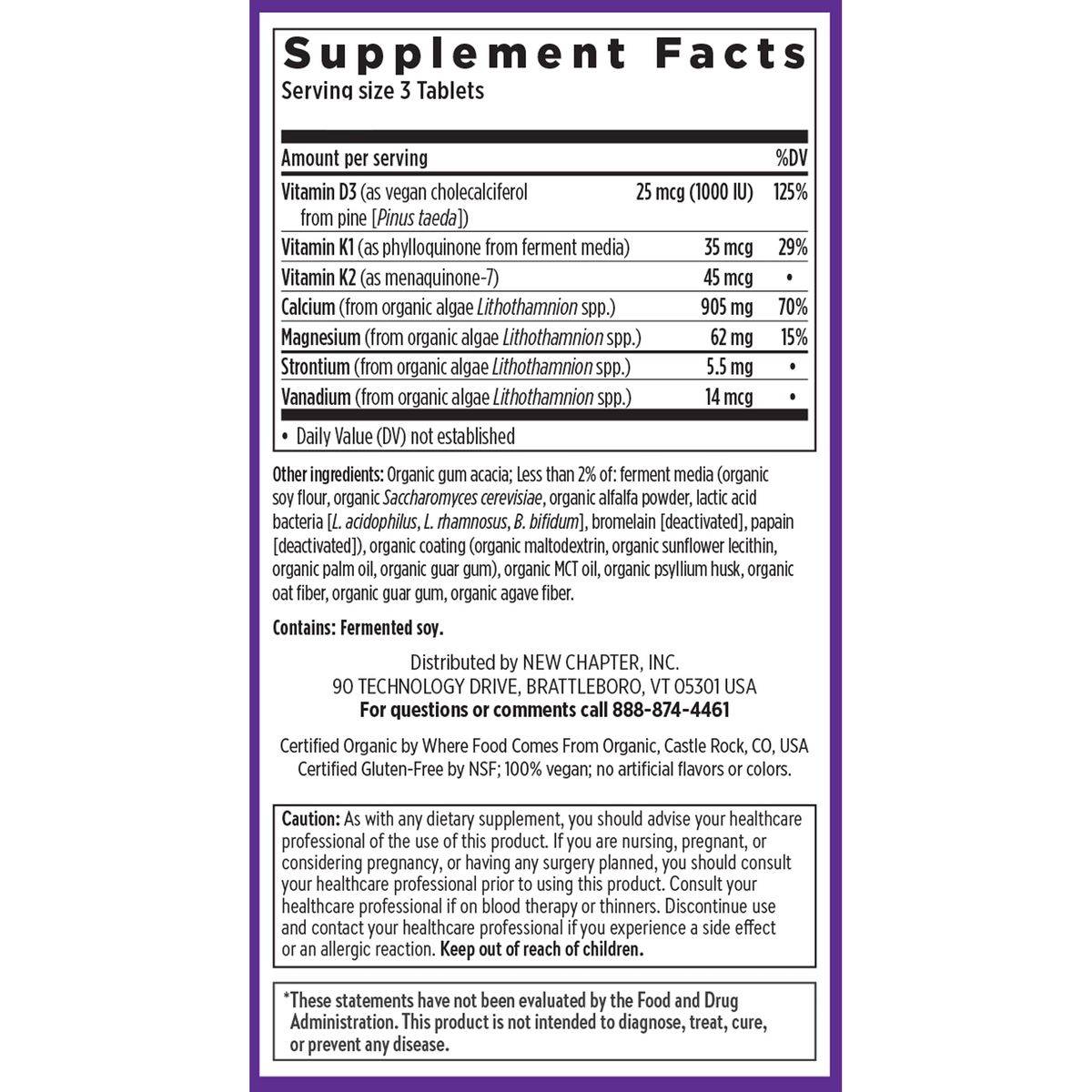 Vitamin D3 (as vegan cholecalciferol from pine [Pinus taeda]), Vitamin K1 (as phylloquinone from ferment media), Vitamin K2 (as menaquinone-7), Calcium (from organic algae Lithothamnion spp.), Magnesium (from organic algae Lithothamnion spp.), Strontium (from organic algae Lithothamnion spp.), Vanadium (from organic algae Lithothamnion spp.), Organic gum acacia, Less than 2% of: ferment media (organic soy flour, organic Saccharomyces cerevisiae, organic alfalfa powder, lactic acid bacteria [L. acidophilus, L. rhamnosus, B. bifidum], bromelain [deactivated], papain [deactivated]), organic coating (organic maltodextrin, organic sunflower lecithin, organic palm oil, organic guar gum), organic MCT oil, organic psyllium husk, organic oat fiber, organic guar gum, organic agave fiber.