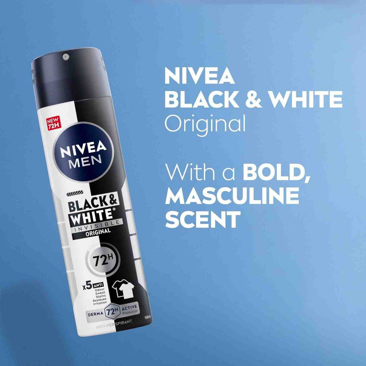 NIVEA Men Deodorant Spray Black & White offers 72-hour protection against odour, sweat, stains, residues, and irritation. Dermatologically proven and alcohol-free, it features a bold masculine scent.