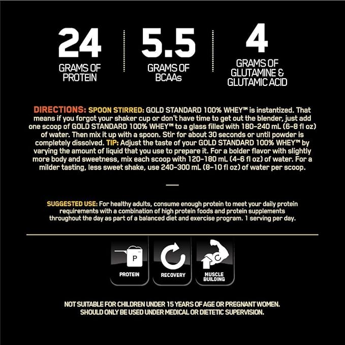 Whey Protein Isolates (WPI) are the purest form of whey protein that currently exists. WPIs are costly to use, but rate among the best proteins that money can buy. That's why they're the first ingredient you read on the Gold Standard 100% Whey™ label. By using WPI as the primary ingredient along with premium ultra-filtered whey protein concentrate (WPC), we're able to pack 24 grams of protein into every serving to support your muscle building needs after training. ON's attention to detail also extends to mixability. This superior quality powder has been instantized to mix easily using a shaker cup or just a glass and spoon. There's no doubt that this is the standard by which all other whey proteins are measured.