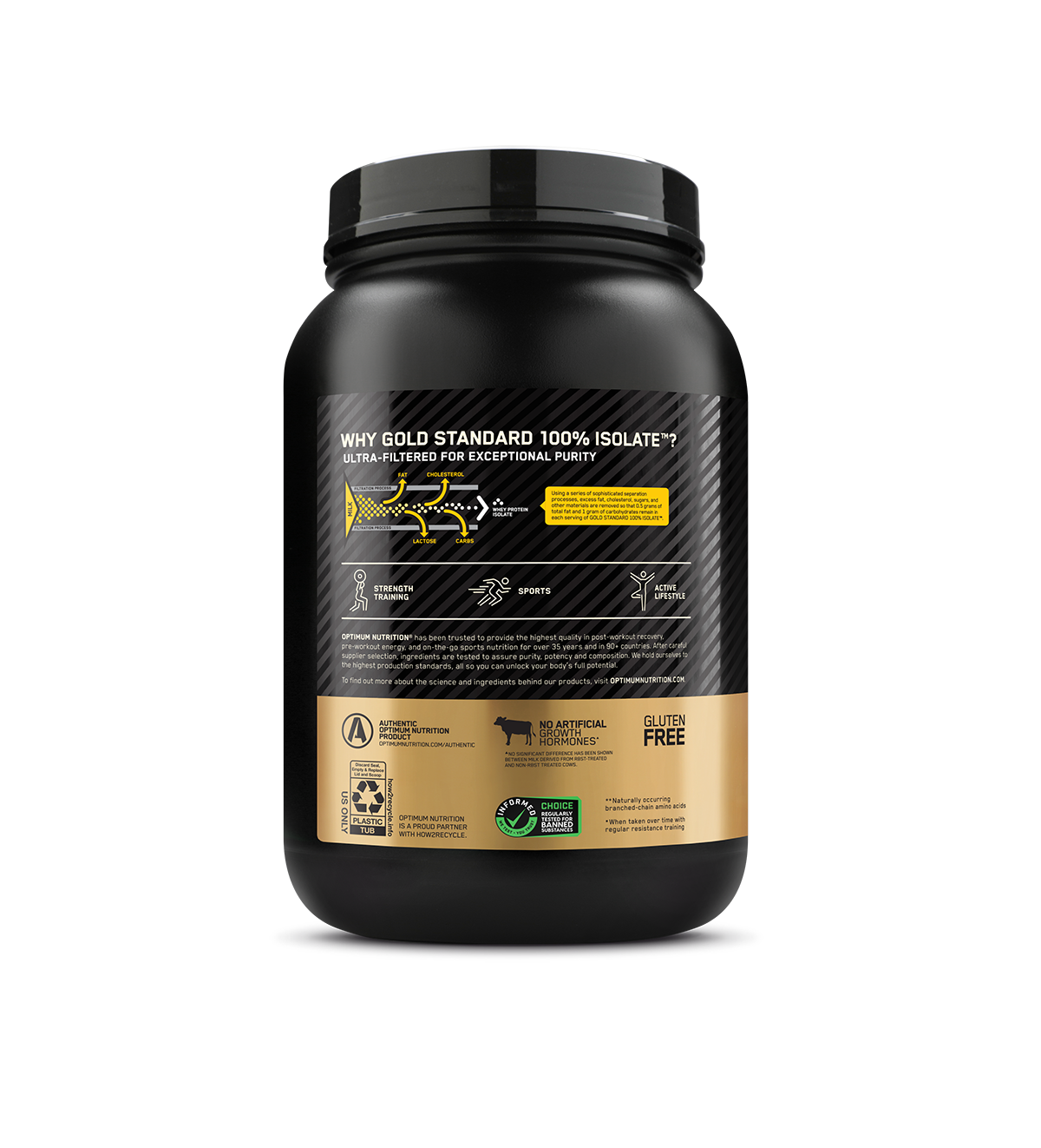 GOLD STANDARD 100% Isolate protein powder supports muscle and recovery3 with 25g of ultra-filtered whey protein and 5.5g of naturally occurring BCAAs per serving.