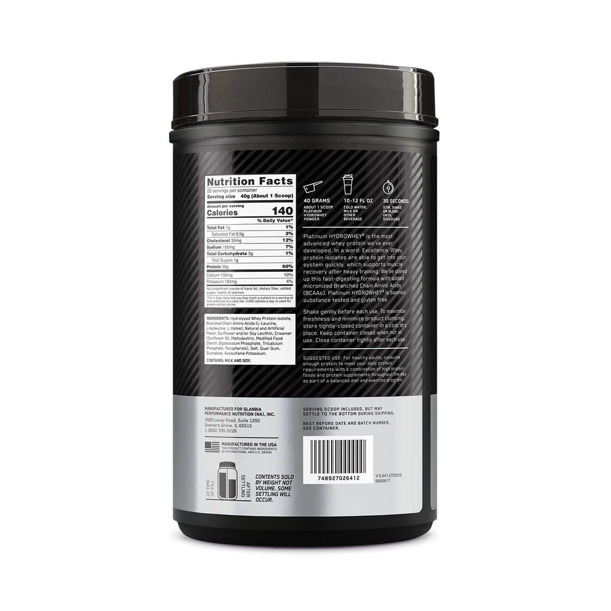 Platinum Hydrowhey® is the most advanced whey protein we've ever developed. In a word: Excellence. By hydrolyzing whey protein isolates to break larger proteins down into smaller pieces, these ultra-pure whey isolates are able to get into your system rapidly, enabling your muscles to start recovering from heavy training. We've dialed up this ultra pure and rapidly-digesting formula with added micronized Branched Chain Amino Acids (BCAAs).