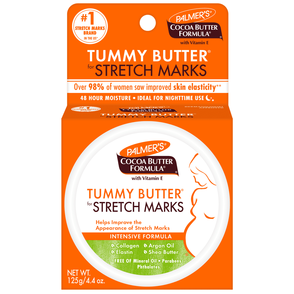 Palmer's Cocoa Butter Formula Tummy Butter is an intensive treatment for stretch marks, enriched with Cocoa Butter, Shea Butter, and Vitamin E. Ideal for nighttime use, it provides 48-hour moisture and helps improve skin elasticity.