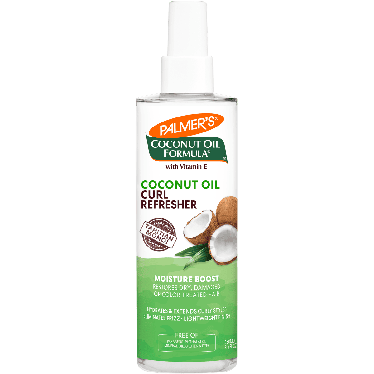 Palmers Coconut Oil Formula Moisture Boost Curl Refresher Spray hydrates and revives curls between wash days. Infused with coconut oil and Tahitian Monoi, it adds moisture, definition, and shine while soothing dry scalp. Free from parabens, phthalates, mineral oil, gluten, and dyes, it is suitable for all curl patterns and textures.