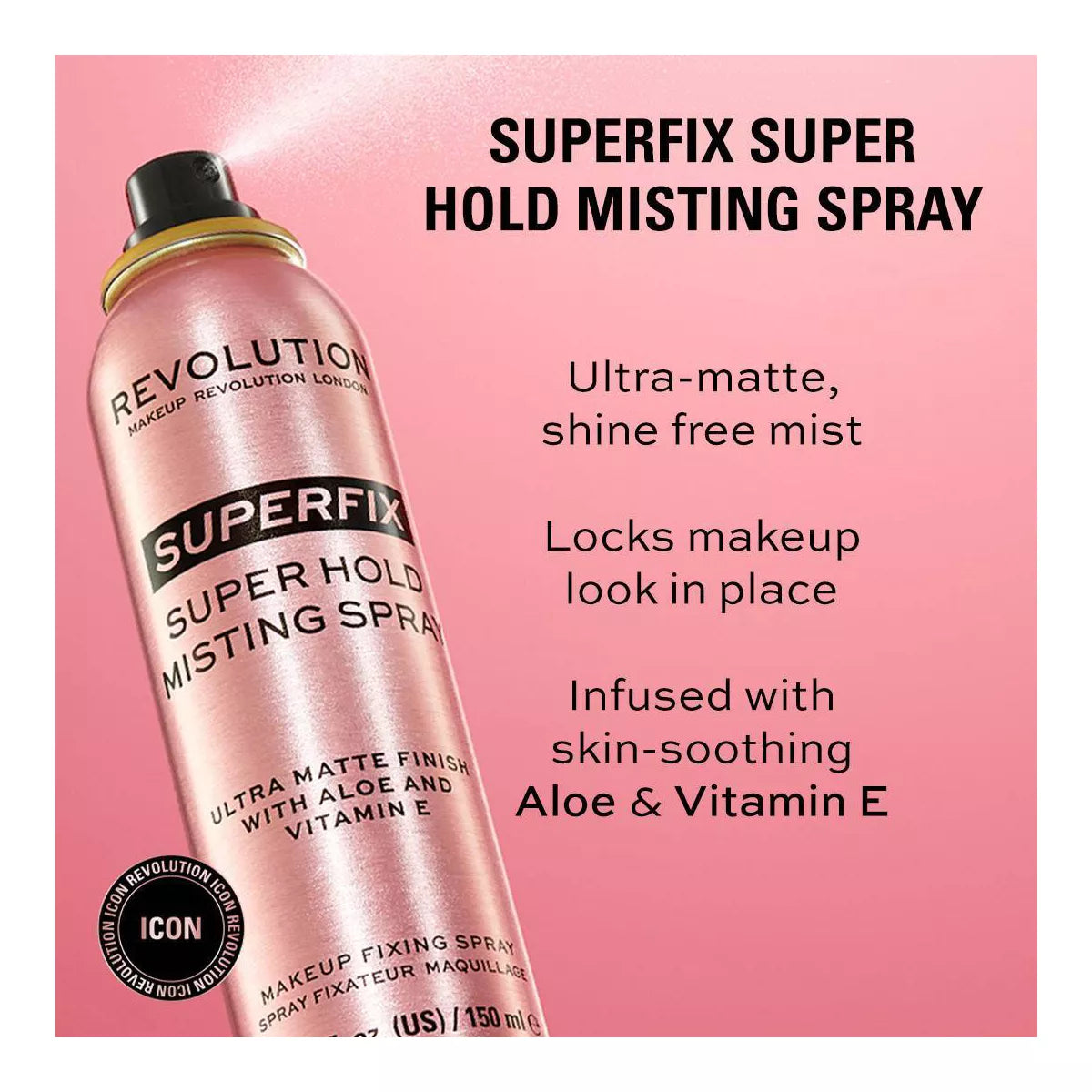 Revolution Makeup Superfix Misting Spray is a long-lasting, ultra-matte fixing mist that locks your makeup in place for up to 16 hours. Infused with Aloe Vera and Vitamin E, it provides a shine-free finish while soothing the skin. Ideal for all-day wear, it is smudge-proof and transfer-resistant.
