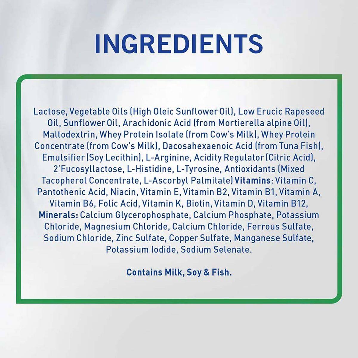 Lactose, Vegetable Oils (High Oleic Sunflower Oil, Low Erucic Rapeseed Oil, Sunflower Oil), Arachidonic Acid (from Mortierella alpine Oil), Maltodextrin, Whey Protein Isolate (from Cow's Milk), Whey Protein Concentrate (from Cow's Milk), Docosahexaenoic Acid (from Tuna Fish), Emulsifier (Soy Lecithin), L-Arginine, Acidity Regulator (Citric Acid), 2'Fucosyllactose, L-Histidine, L-Tyrosine, Antioxidants (Mixed Tocopherol Concentrate, L-Ascorbyl Palmitate), Vitamins: Vitamin C, Pantothenic Acid, Niacin, Vitamin E, Vitamin B2, Vitamin B1, Vitamin A, Vitamin B6, Folic Acid, Vitamin K, Biotin, Vitamin D, Vitamin B12, Minerals: Calcium Glycerophosphate, Calcium Phosphate, Potassium Chloride, Magnesium Chloride, Calcium Chloride, Ferrous Sulfate, Sodium Chloride, Zinc Sulfate, Copper Sulfate, Manganese Sulfate, Potassium Iodide, Sodium Selenate. Contains Milk, Soy & Fish.