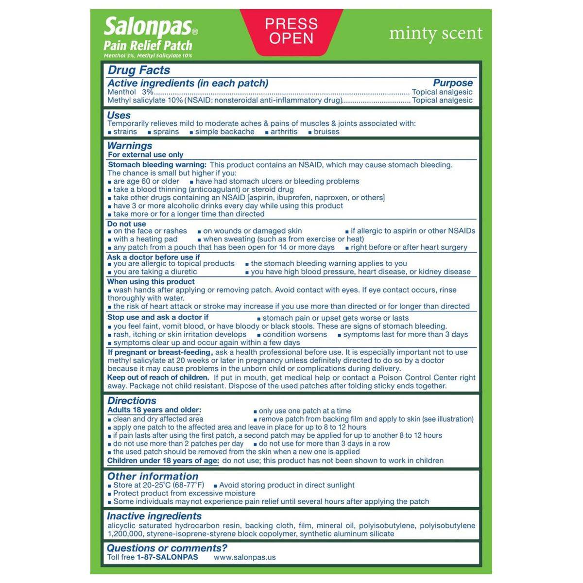 For external use only. Stomach bleeding warning: This product contains an NSAID, which may cause stomach bleeding. The chance is small but higher if you are age 60 or older, have had stomach ulcers or bleeding problems, take a blood thinning (anticoagulant) or steroid drug, take other drugs containing an NSAID [aspirin, ibuprofen, naproxen, or others], have 3 or more alcoholic drinks every day while using this product, take more or for a longer time than directed. Do not use on the face or rashes, with a heating pad, any patch from a pouch that has been open for 14 or more days, on wounds or damaged skin, if allergic to aspirin or other NSAIDS, when sweating (such as from exercise or heat), right before or after heart surgery, if you are allergic to topical products, if the stomach bleeding warning applies to you, you have high blood pressure, heart disease, or kidney disease. Ask a doctor before use if you are taking a diuretic. When using this product, wash hands after applying or removing patch. Avoid contact with eyes. If eye contact occurs, rinse thoroughly with water. The risk of heart attack or stroke may increase if you use more than directed or for longer than directed. Stop use and ask a doctor if stomach pain or upset gets worse or lasts, you feel faint, vomit blood, or have bloody or black stools. These are signs of stomach bleeding. Rash, itching or skin irritation develops, condition worsens, symptoms last for more than 3 days, symptoms clear up and occur again within a few days. If pregnant or breast-feeding, ask a health professional before use. It is especially important not to use methyl salicylate at 20 weeks or later in pregnancy unless definitely directed to do so by a doctor because it may cause problems in the unborn child or complications during delivery. Keep out of reach of children. If put in mouth, get medical help or contact a Poison Control Center right away. Package not child resistant. Dispose of the used patches after folding sticky ends together.