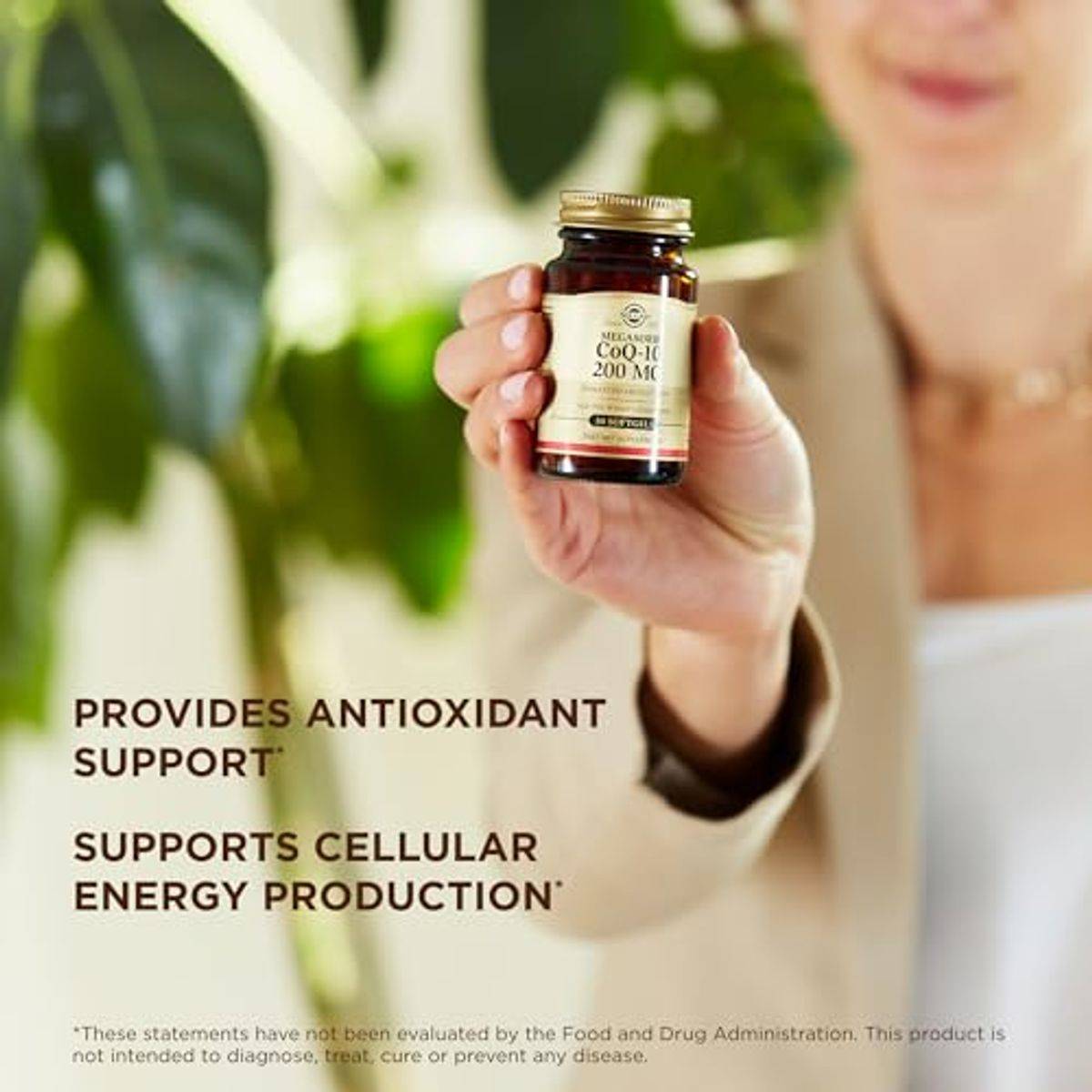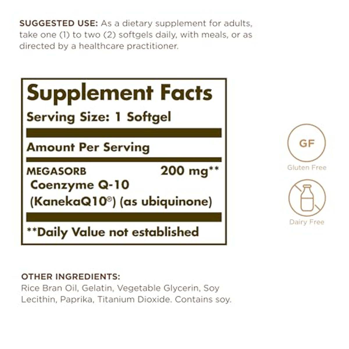 Solgar CoQ10 200mg softgels provide essential antioxidant support, promoting heart and neurological health. Formulated for enhanced absorption, free from gluten, wheat, and dairy.