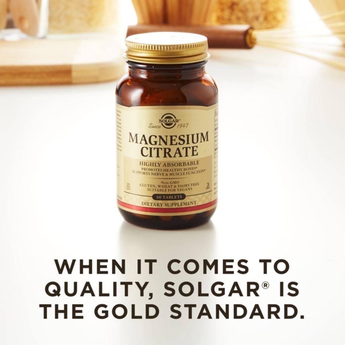 Solgar Magnesium Citrate is a highly absorbable dietary supplement that promotes healthy bones and supports nerve and muscle function. Non-GMO, gluten, wheat, and dairy-free, it is suitable for vegans. Take two tablets daily to support overall well-being.