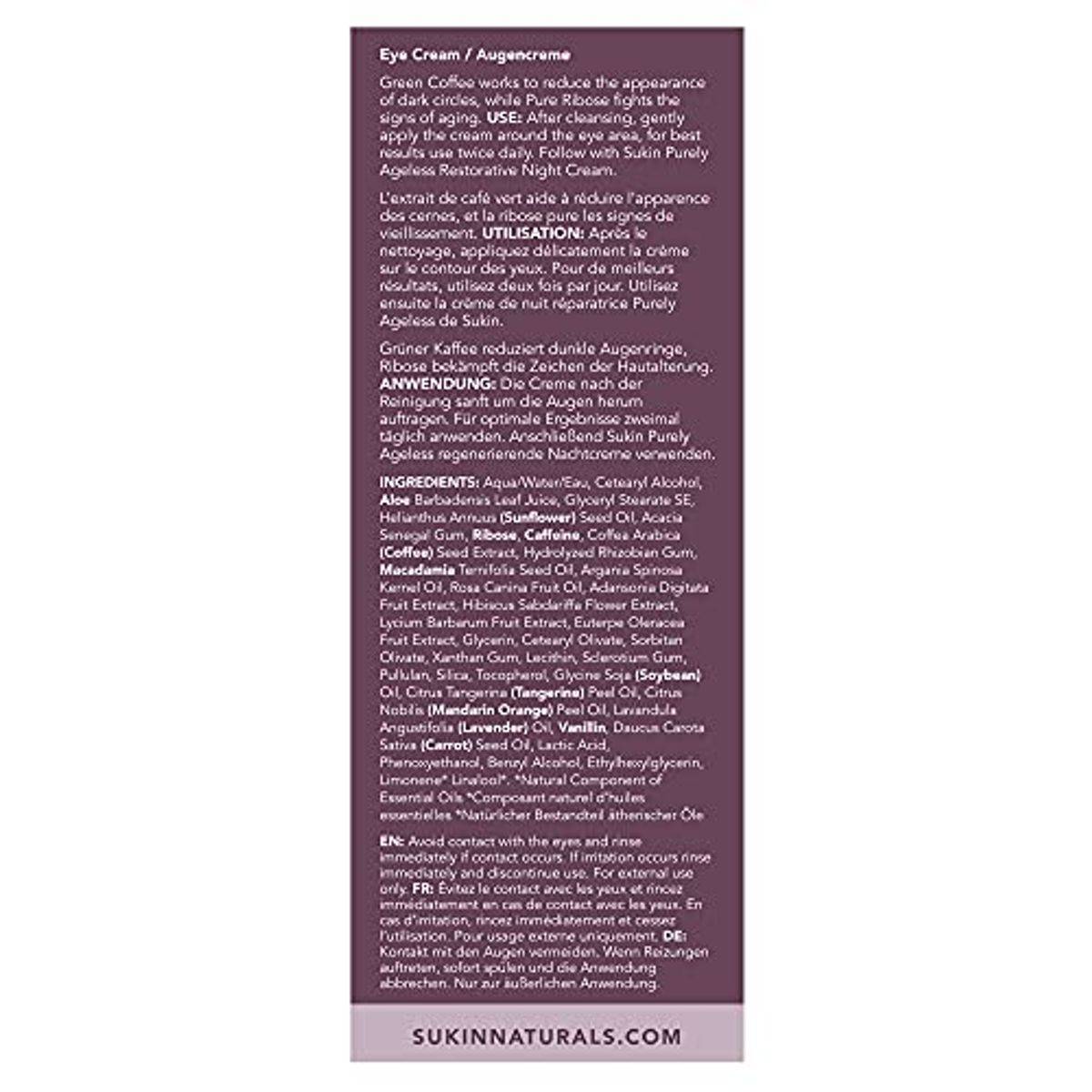 Sukin Purely Ageless Reviving Eye Cream hydrates and smooths the sensitive eye area. Infused with Green Coffee and Pure Ribose to reduce dark circles and signs of aging. Ideal for daily use on all skin types.