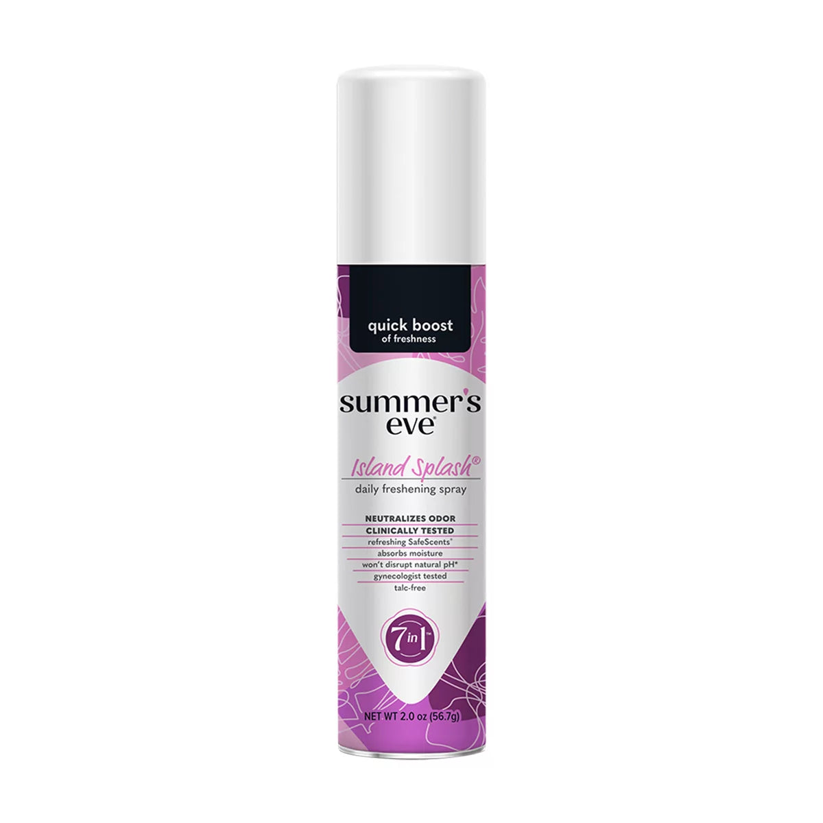 Summer's Eve Island Splash Freshening Spray offers 5 fresh benefits in one spray. Ideal for a quick freshness boost, it neutralizes odor and absorbs moisture. Hypoallergenic and gynecologist-tested, this spray is safe for sensitive skin.