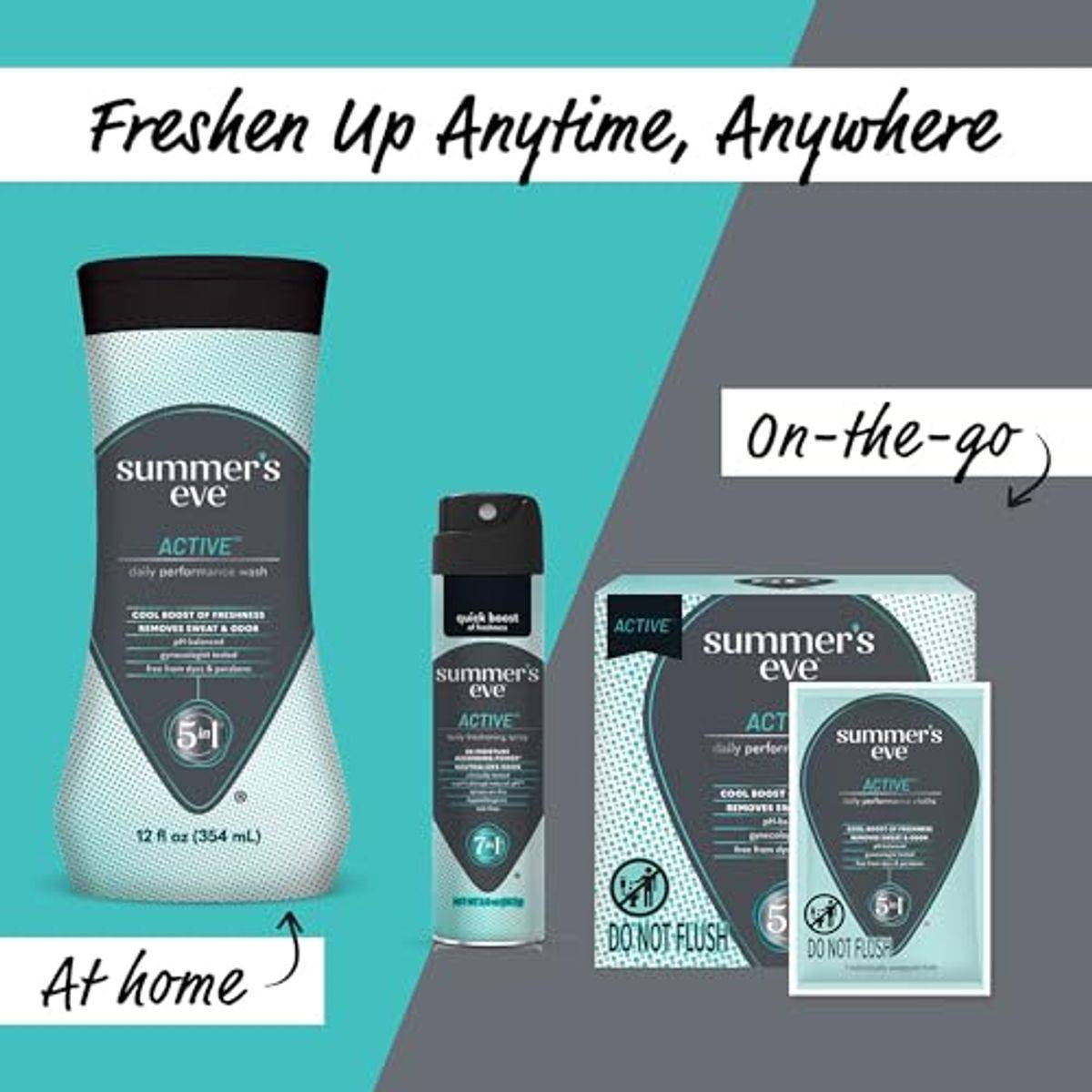 Summer's Eve Active Daily Performance Wash is a pH-balanced feminine wash designed to remove sweat and odor. Infused with eucalyptus and peppermint oils, it provides a cool boost of freshness. Suitable for sensitive skin, it is gynecologist-tested and free from dyes and parabens. Ideal for an active lifestyle.