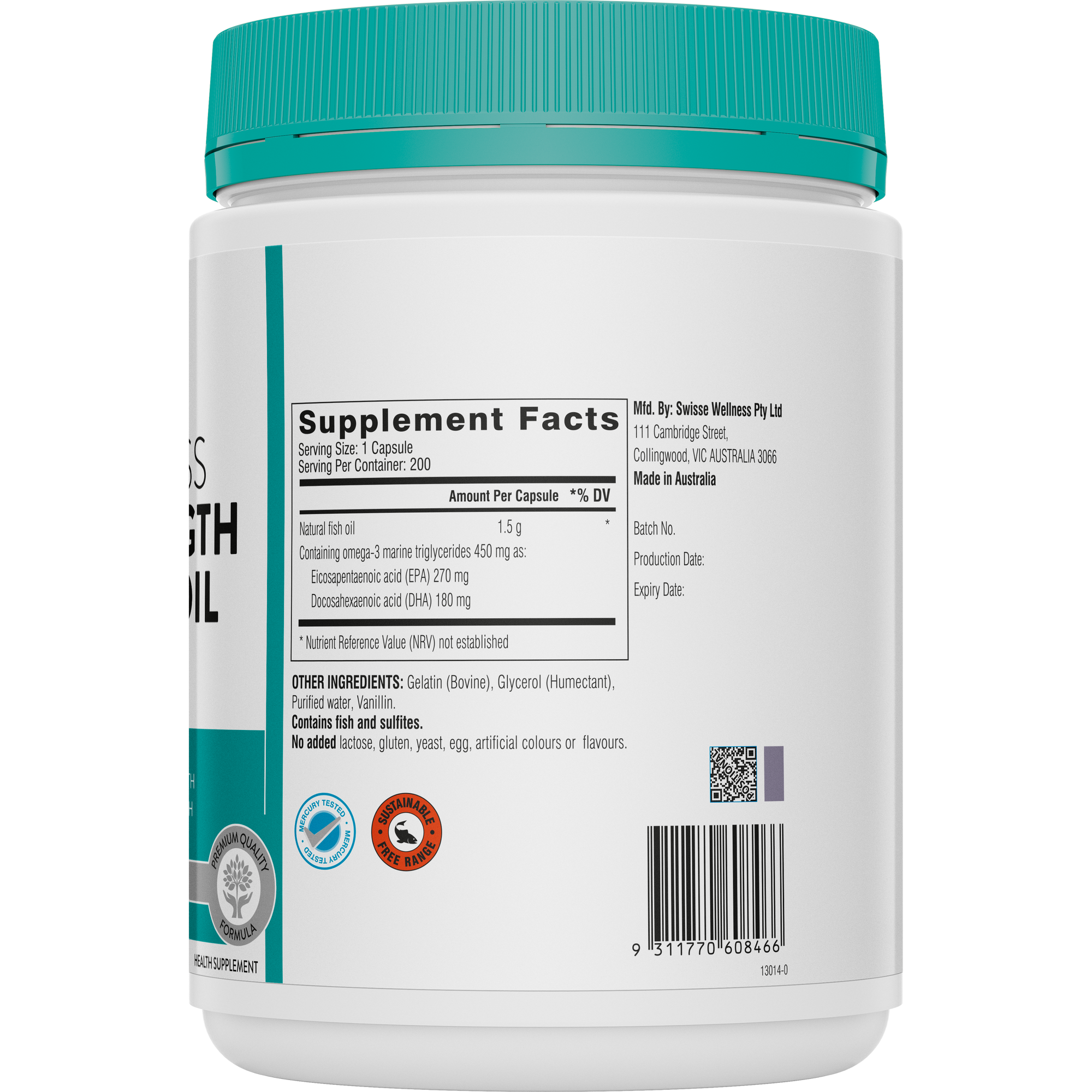Support heart, brain and eye health with our Odourless High Strength Wild Fish Oil 1500mg, rich in omega-3 fatty acids EPA and DHA. Sourced from wild fish, this high-strength supplement maintains nervous system health and supports heart, brain and eye health, making it a cornerstone of your daily health regimen. Our odorless fish oil is sustainably sourced, and third party tested for heavy metal content, including mercury, lead, arsenic, and cadmium ensuring purity and safety.