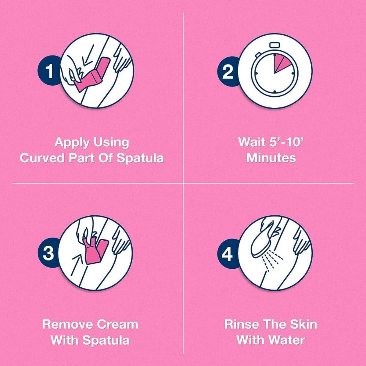 Apply a thick, even layer using the provided spatula. Leave on for 5-10 minutes. Remove hair and rinse with warm water.