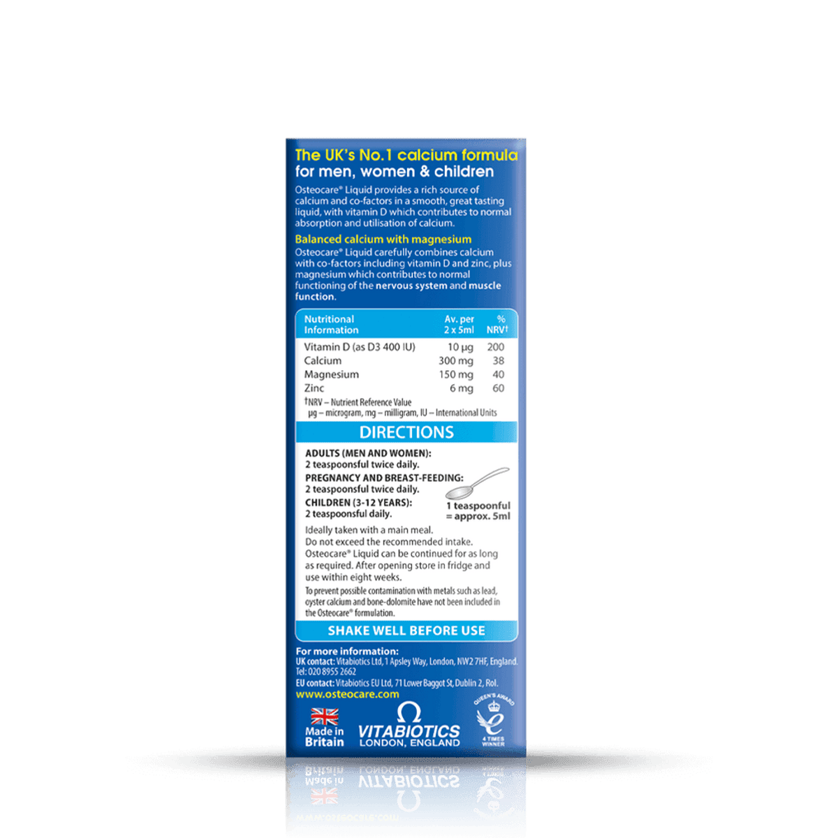Vitabiotics Osteocare Liquid is a calcium supplement designed for bone health. It combines calcium with magnesium, vitamin D, and zinc, ideal for those who have difficulty swallowing tablets. Suitable for children over 3 years, adults, pregnant and breastfeeding women, and vegetarians.