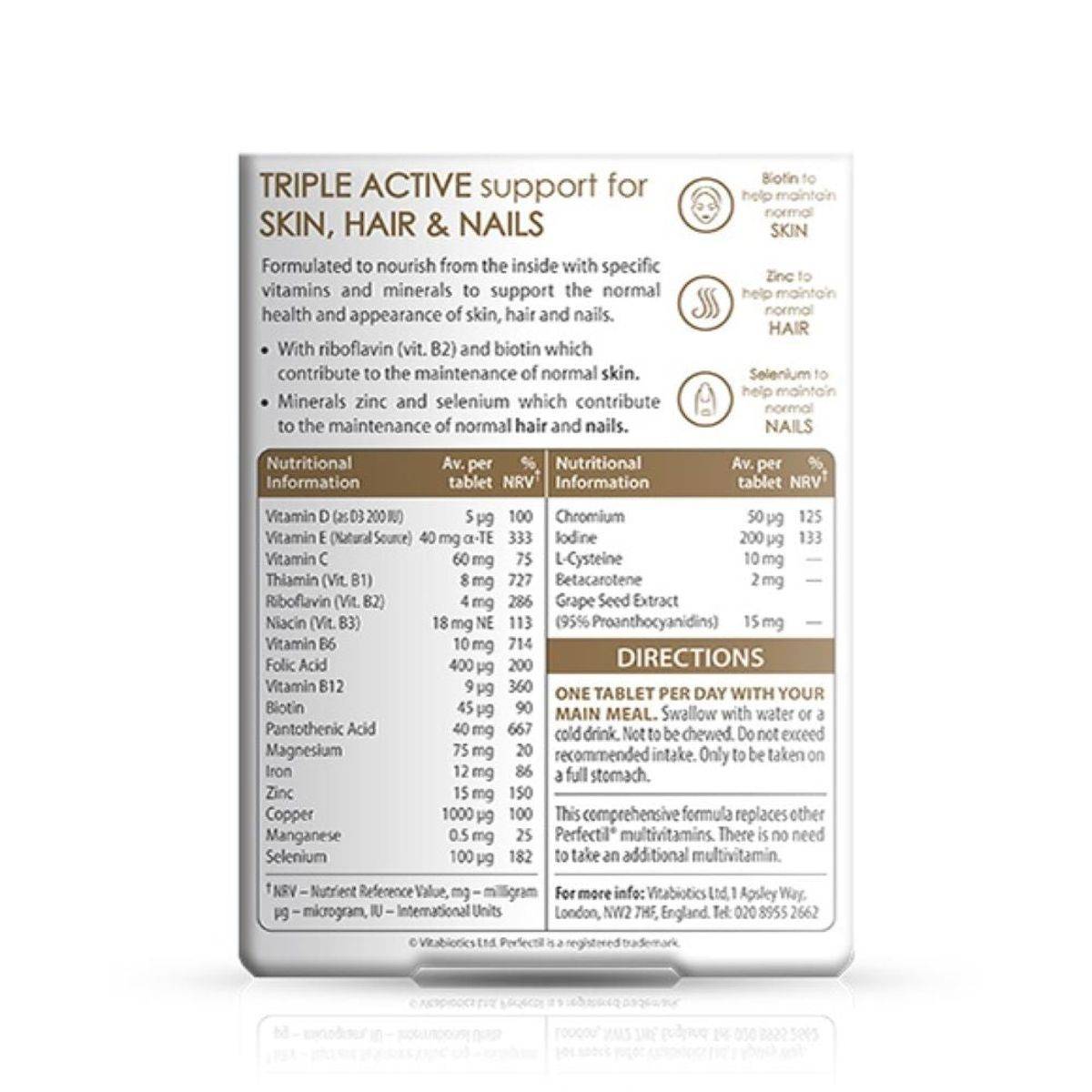 Vitabiotics Perfectil Original is a comprehensive beauty supplement designed to support the health of your skin, hair, and nails from within. Each tablet is formulated with a unique blend of vitamins, minerals, and nutrients that work together to nourish your beauty. With over 20 essential nutrients, including Biotin, Zinc, and Selenium, Perfectil Original helps maintain healthy skin, strong nails, and vibrant hair, ensuring you look and feel your best every day.