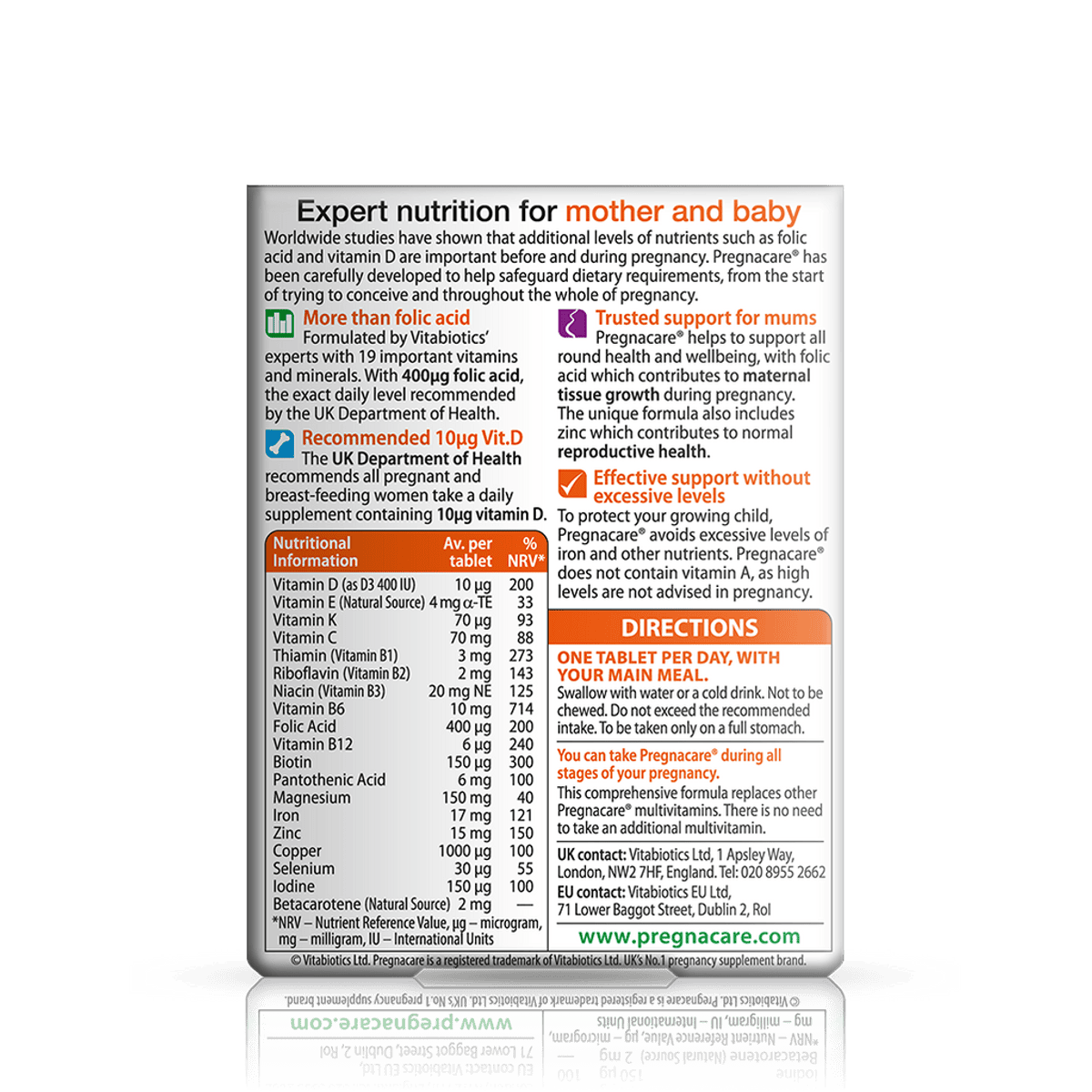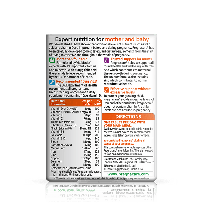 Vitabiotics Pregnacare Original provides expert nutrition for mother and baby, contributing to maternal tissue growth during pregnancy. Contains 400µg folic acid and 10µg vitamin D, as advised by the UK Department of Health. Includes 19 important nutrients for overall support, such as zinc for normal reproductive health.
