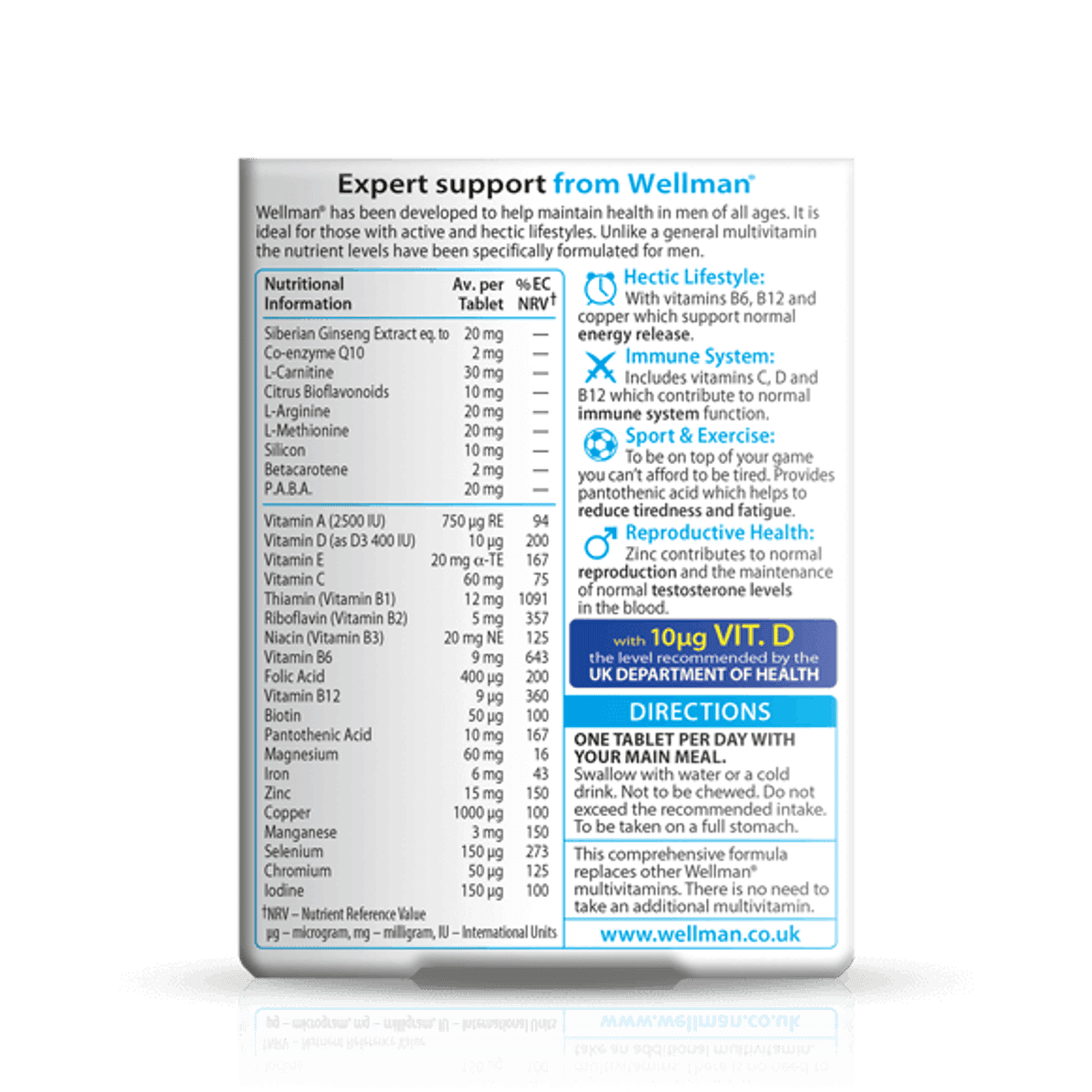 Vitabiotics Wellman 30 Tablets are specially formulated multivitamins for men, supporting health and vitality with 29 nutrients including vitamins A, C, D, B6, B12, and zinc. Ideal for active lifestyles, it helps reduce tiredness and supports immune function and reproductive health.