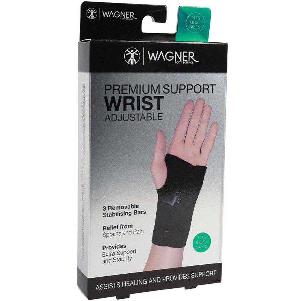 The Wagner Body Science Premium Support Wrist Adjustable is designed to fit most sizes, providing relief from sprains and pain. It features three removable stabilising bars for extra support and stability, assisting in healing. Ideal for those seeking enhanced wrist support.