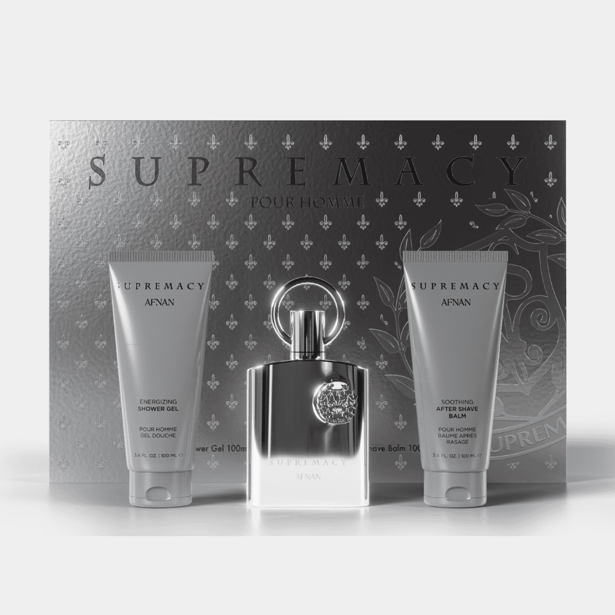 Afnan Supremacy Silver Set includes a 100ml Eau de Parfum, energizing shower gel, and soothing aftershave balm. Perfect for daily grooming, offering a refreshing and sophisticated scent.
